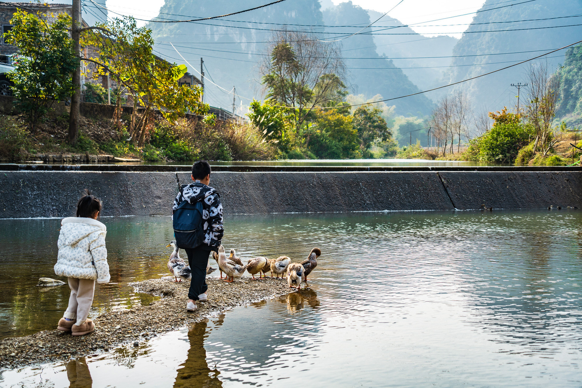 Hai con của anh Nhật thích thú dạo chơi ở ngôi làng cổ