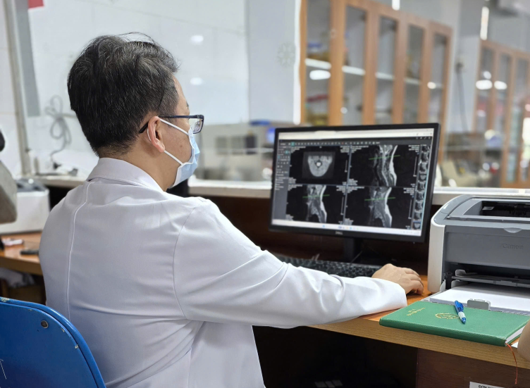 Bác sĩ xem hình ảnh ghi nhận một ca tổn thương tủy sống do bóng cười tại Bệnh viện Bạch Mai. Ảnh: BSCC.