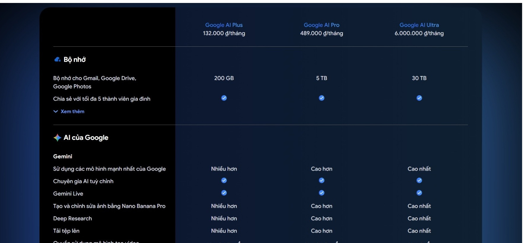 So sánh các gói Google AI tại Việt Nam. Ảnh chụp màn hình