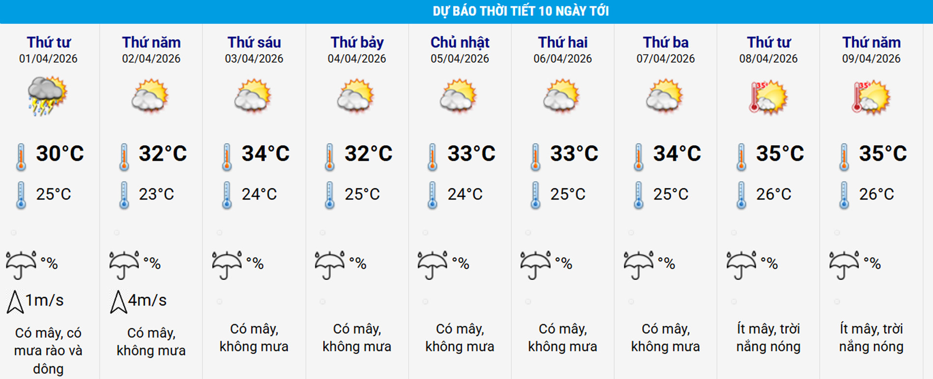 Cơ quan khí tượng dự báo, ngày 1-2/4, khu vực miền Đông Nam Bộ tiếp tục có nắng nóng với nhiệt độ cao nhất phổ biến 35-36 độ, có nơi trên 36 độ; độ ẩm tương đối thấp nhất từ 40-45%; thời gian nóng 13-16h. Nắng nóng tại khu vực này có khả năng kéo dài trong nhiều ngày tới.