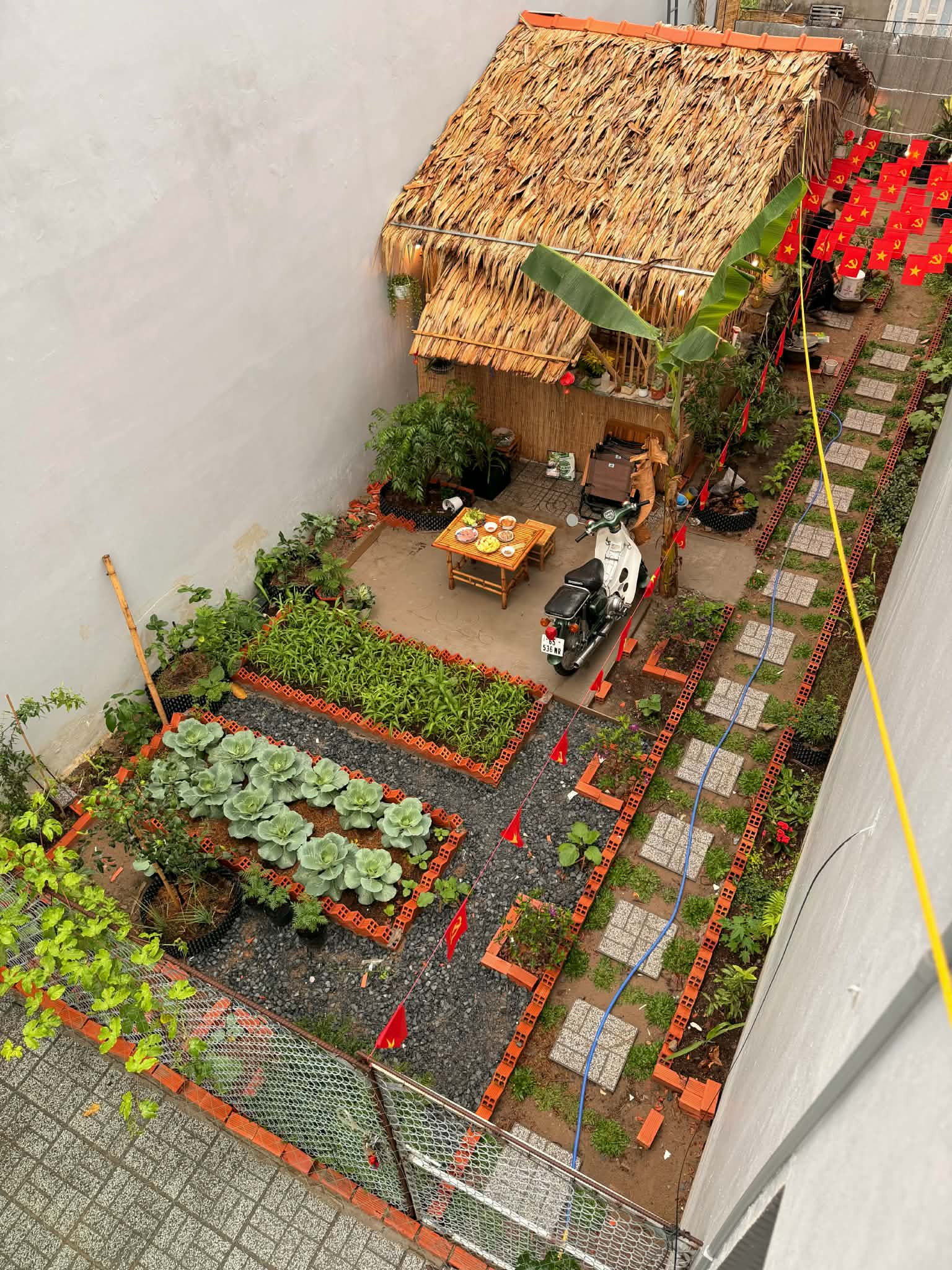 Sau khi góc nhà chòi và sân vườn hoàn thiện, Trung và Duy trang trí thêm một số chi tiết như lá cờ, đèn lồng, đèn LED, chum nước, chậu cây…, tạo không gian thư giãn đẹp mắt để đón Tết.
