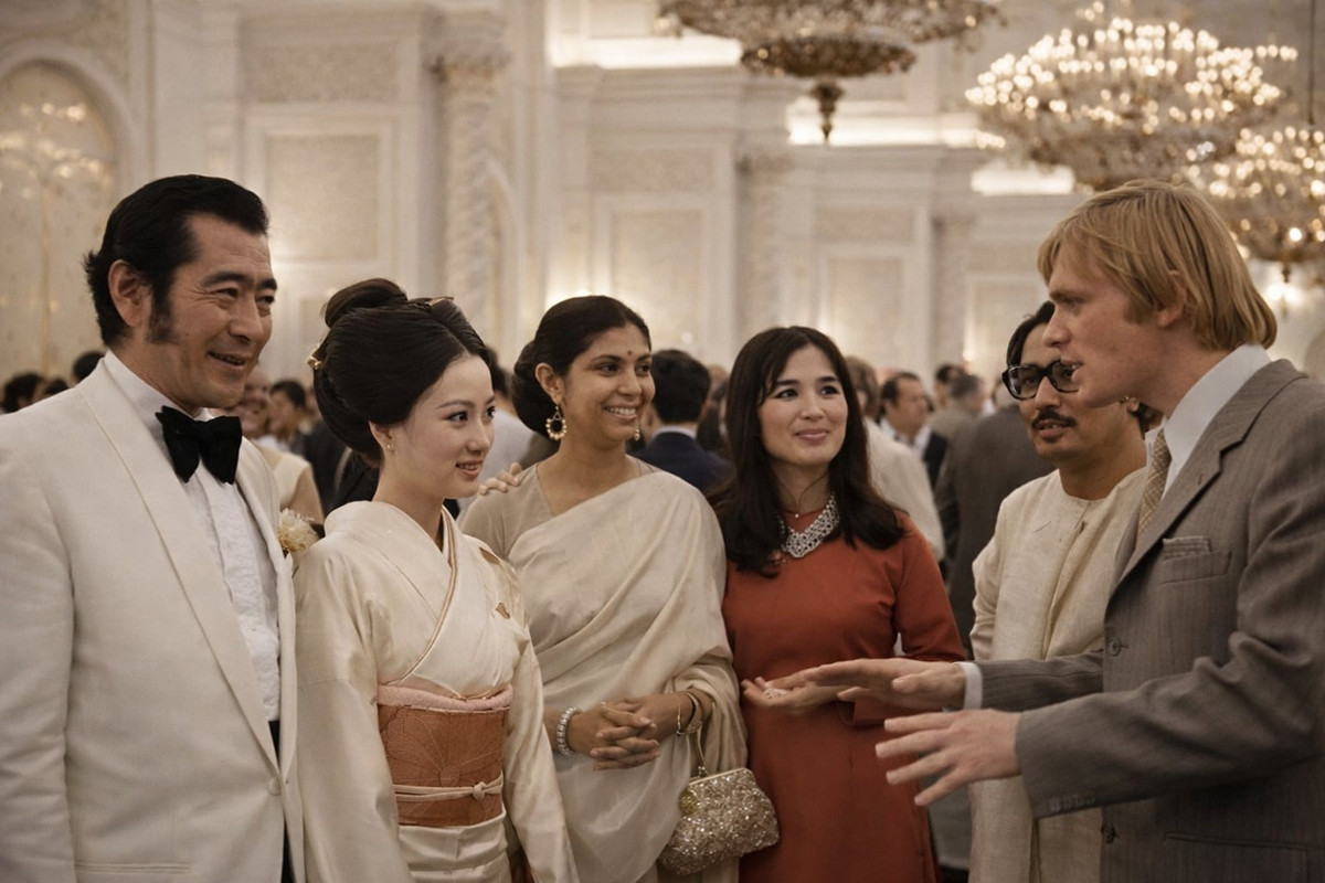 Bên trái là thành viên ban giám khảo, nam diễn viên Nhật Bản Toshiro Mifune cùng phu nhân. Ông xuất hiện với phong thái lịch lãm, điềm đạm, thu hút ánh nhìn giữa không gian sang trọng. Người đứng thứ ba từ bên trái là nữ diễn viên Ấn Độ Sharada, gương mặt tiêu biểu thời bấy giờ, từng tham gia bộ phim Swayamvaram của đạo diễn Adoor Gopalakrishnan.