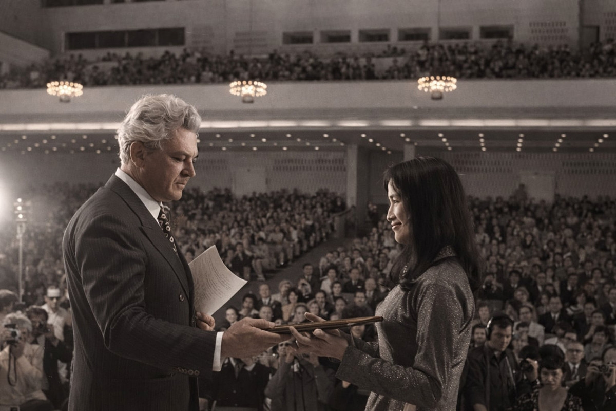 Trong bức ảnh thứ 2, đạo diễn - diễn viên nổi tiếng Liên Xô Sergei Bondarchuk, Trưởng BGK hạng mục Phim truyện đang trao giải thưởng danh giá cho NSND Trà Giang với vai diễn ấn tượng của bà trong bộ phim Vĩ tuyến 17 ngày và đêm.
