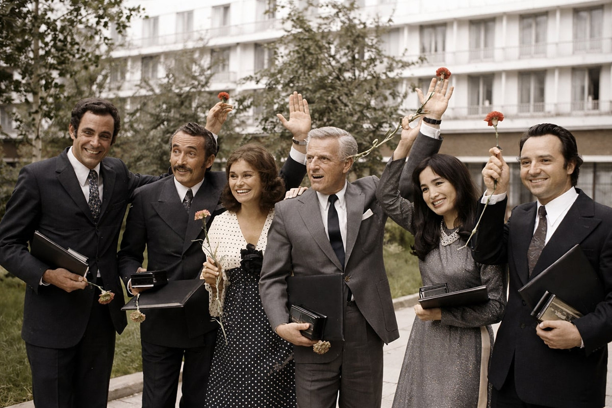 Đứng thứ ba từ bên phải là biểu tượng của điện ảnh cách mạng Việt Nam - NSND Trà Giang, nổi bật với vẻ đẹp dịu dàng và thần thái thanh lịch. Ngoài cùng bên phải là nam diễn viên Liên Xô Oleg Vidov.