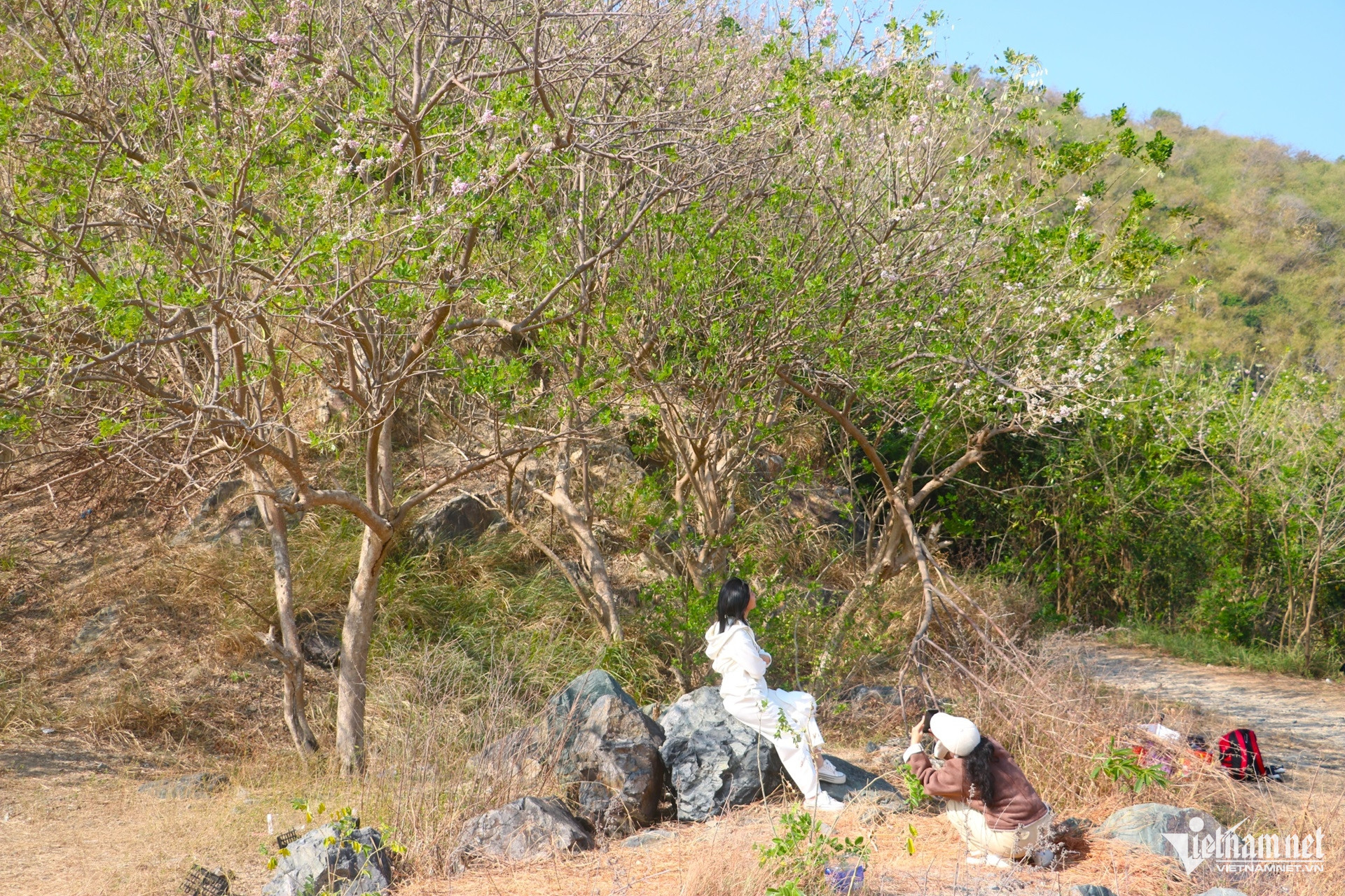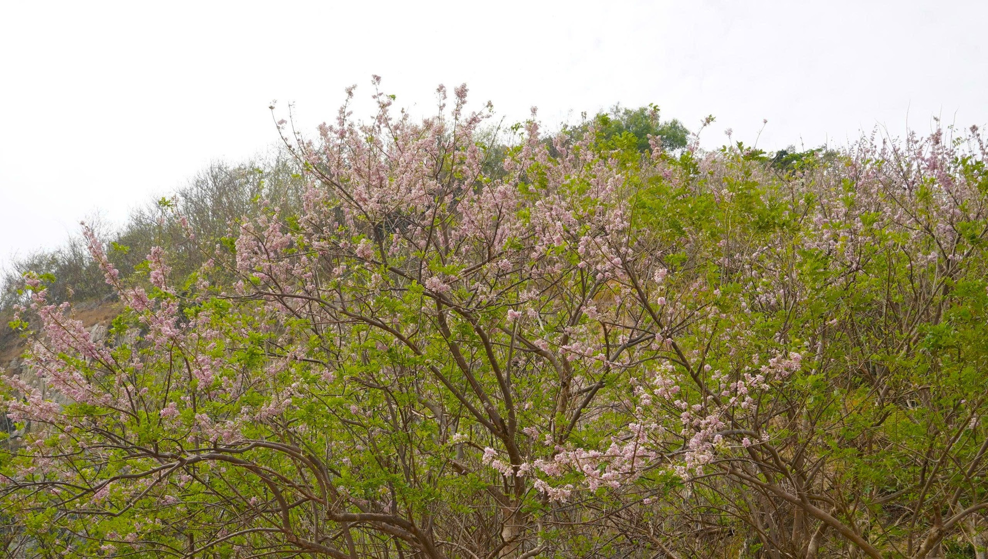 Từ cuối tháng 12, những cụm đỗ mai bắt đầu trổ hoa tại khu vực chân núi Tao Phùng và ven đường Hạ Long. Sắc hồng phớt trải dài trên triền đồi khô cằn, nổi bật giữa nền trời xanh trong và biển khơi phía xa, mang đến khung cảnh nên thơ.