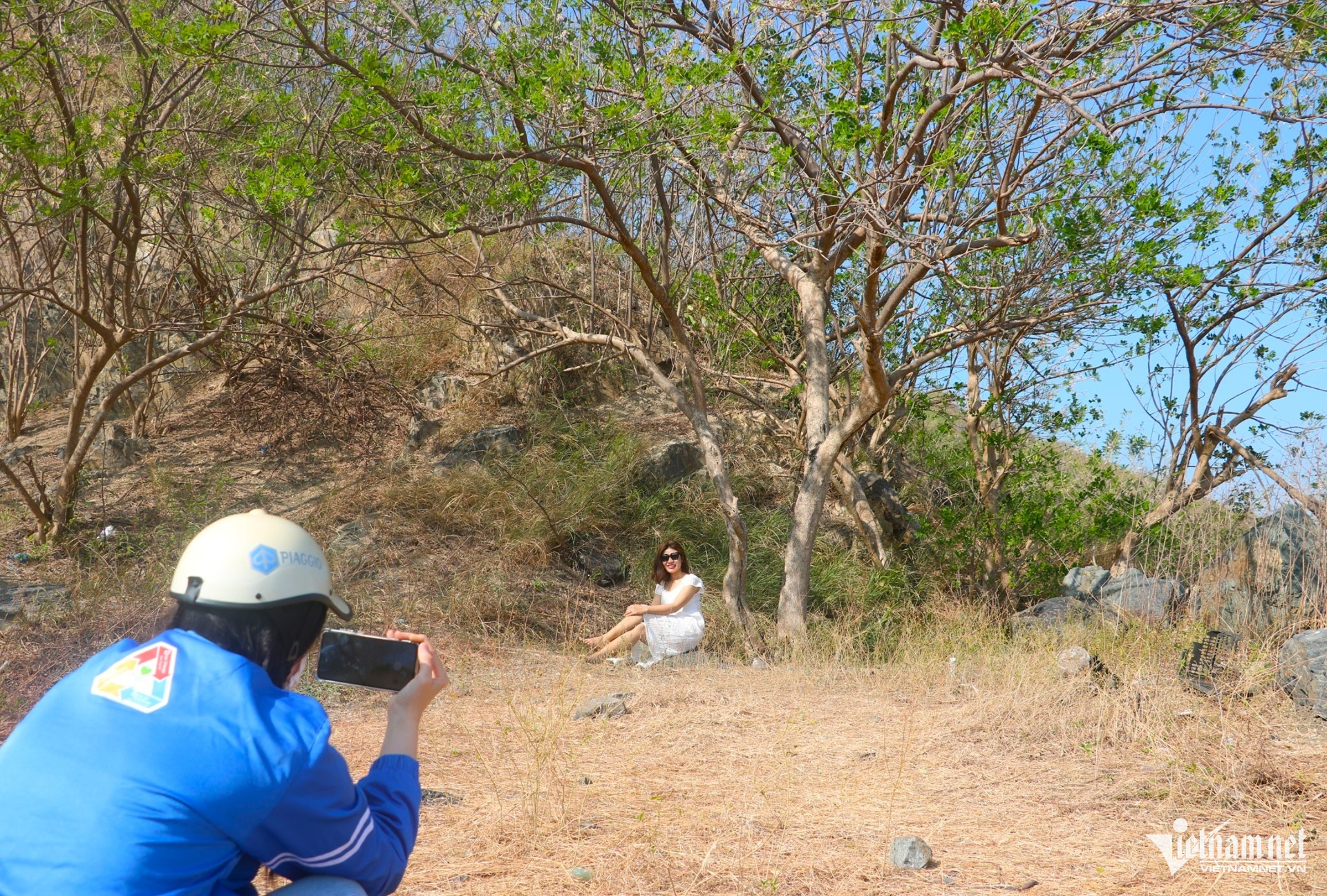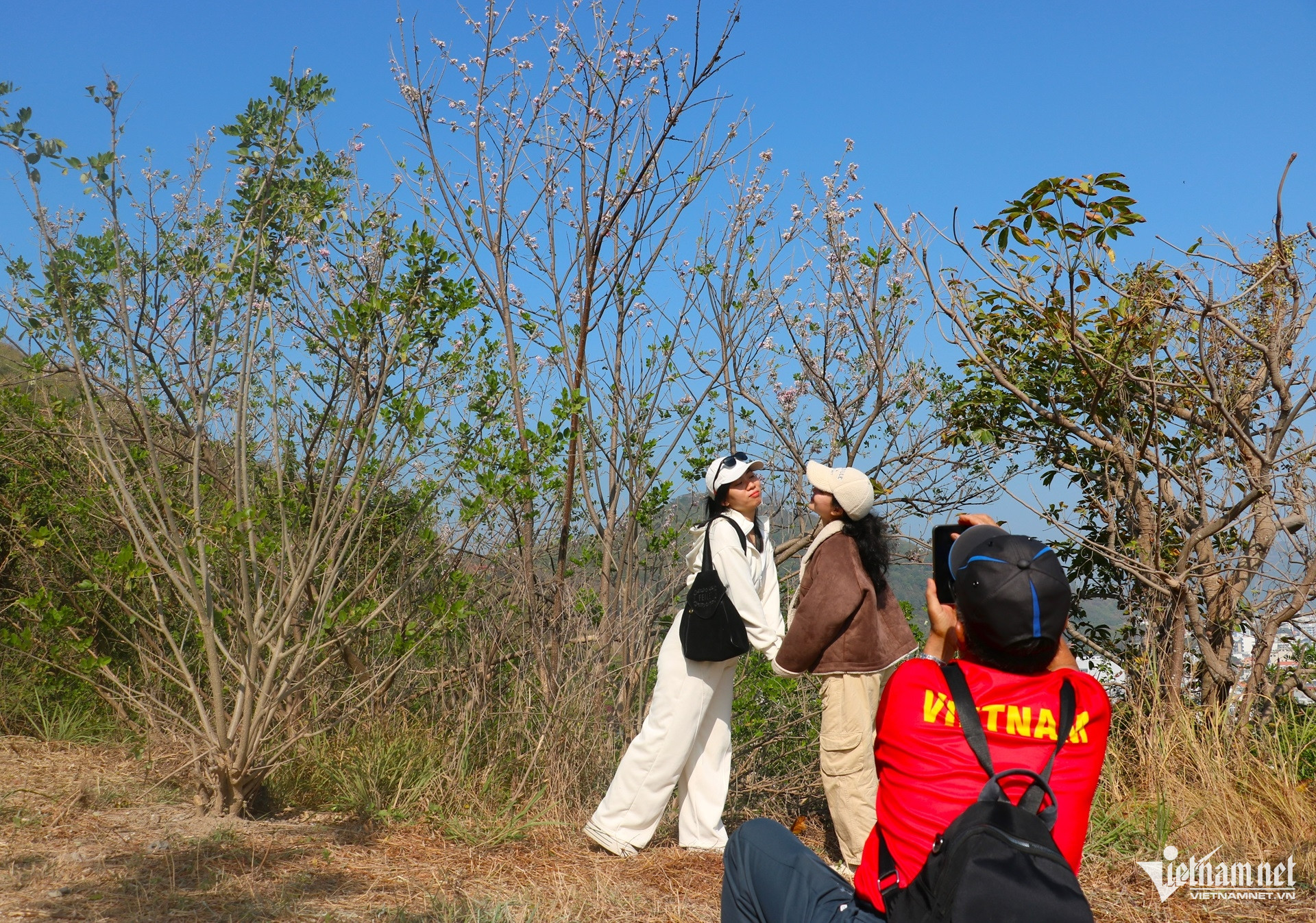 Anh Nguyễn Tuấn Quốc (31 tuổi, trú phường Bình Dương, TPHCM) cho biết, anh và nhóm bạn rủ nhau lên đồi Con Heo từ sáng sớm để “săn” ảnh. “Hoa đỗ mai nở đúng dịp cuối năm khiến không khí Tết rõ rệt hơn. Đứng trên đồi nhìn xuống biển, cảm giác rất thư thái", anh Quốc chia sẻ.