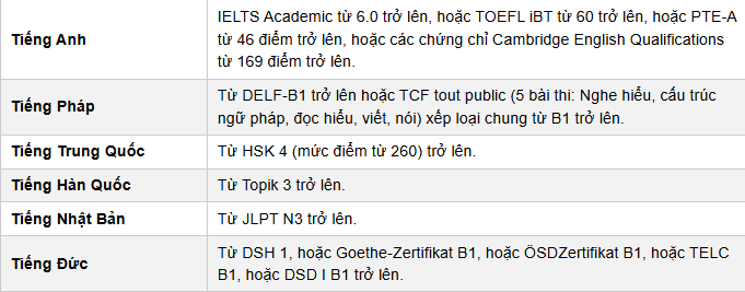 Với phương thức xét tuyển kết hợp điểm học bạ và chứng chỉ quốc tế, thí sinh cần có điểm trung bình 6 học kỳ của 2 môn dùng để xét tuyển (ngoài môn Ngoại ngữ) đạt từ 8,5 trở lên; có tổng điểm 3 môn thi tốt nghiệp THPT đạt từ 22 điểm trở lên; có một trong các chứng chỉ quốc tế sau đây: