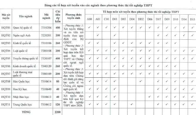 Ngày 26/2, Học viện Ngoại giao thông tin về các phương thức tuyển sinh dự kiến của trường trong năm 2026. Theo đó, Học viện dự kiến tuyển sinh theo 4 phương thức, gồm: Xét tuyển thẳng và ưu tiên xét tuyển, xét tuyển kết hợp điểm học bạ và chứng chỉ quốc tế, xét tuyển kết hợp chứng chỉ SAT/ACT/A-level/bằng IB và chứng chỉ quốc tế, xét tuyển dựa trên điểm thi tốt nghiệp THPT.