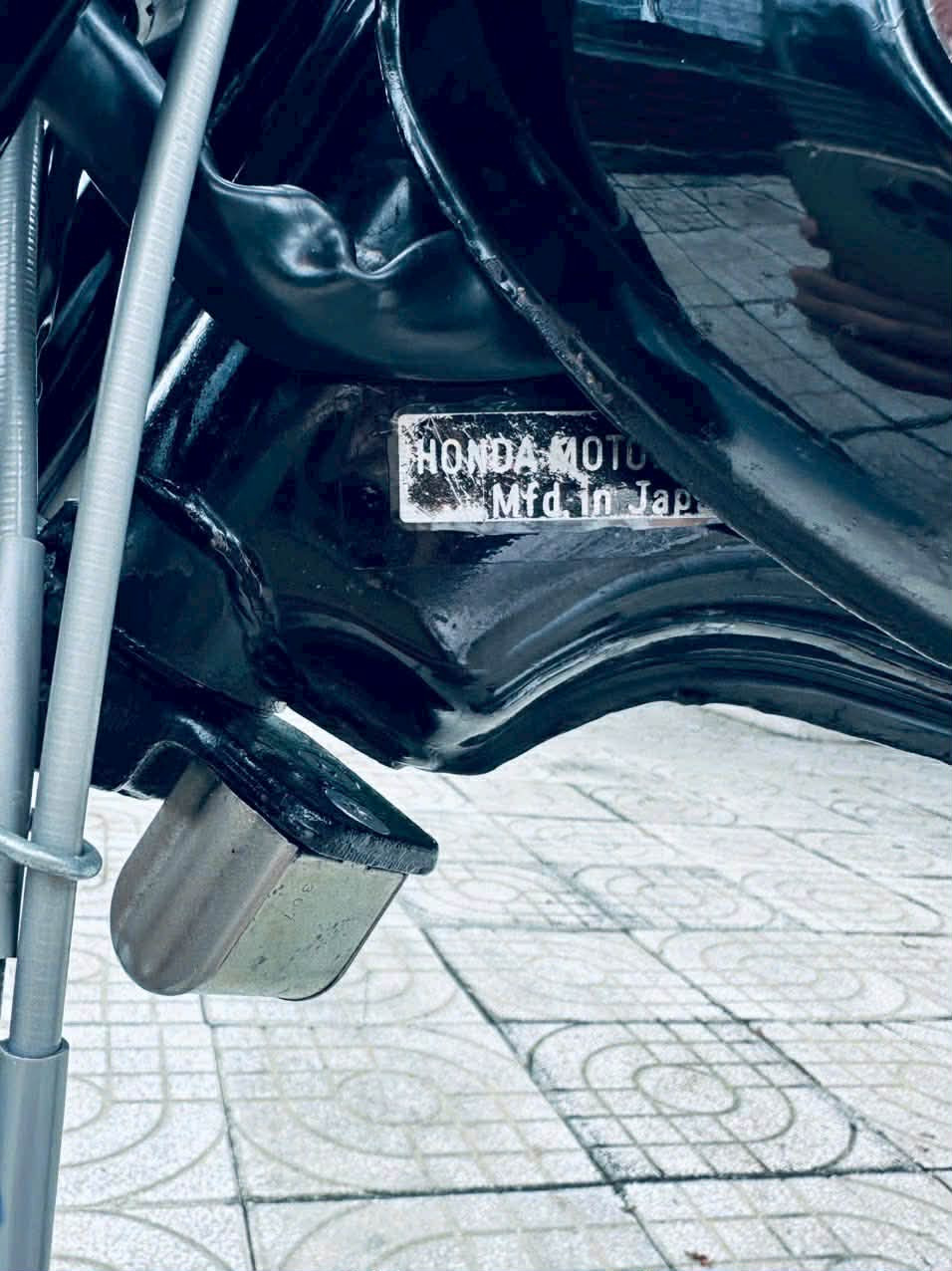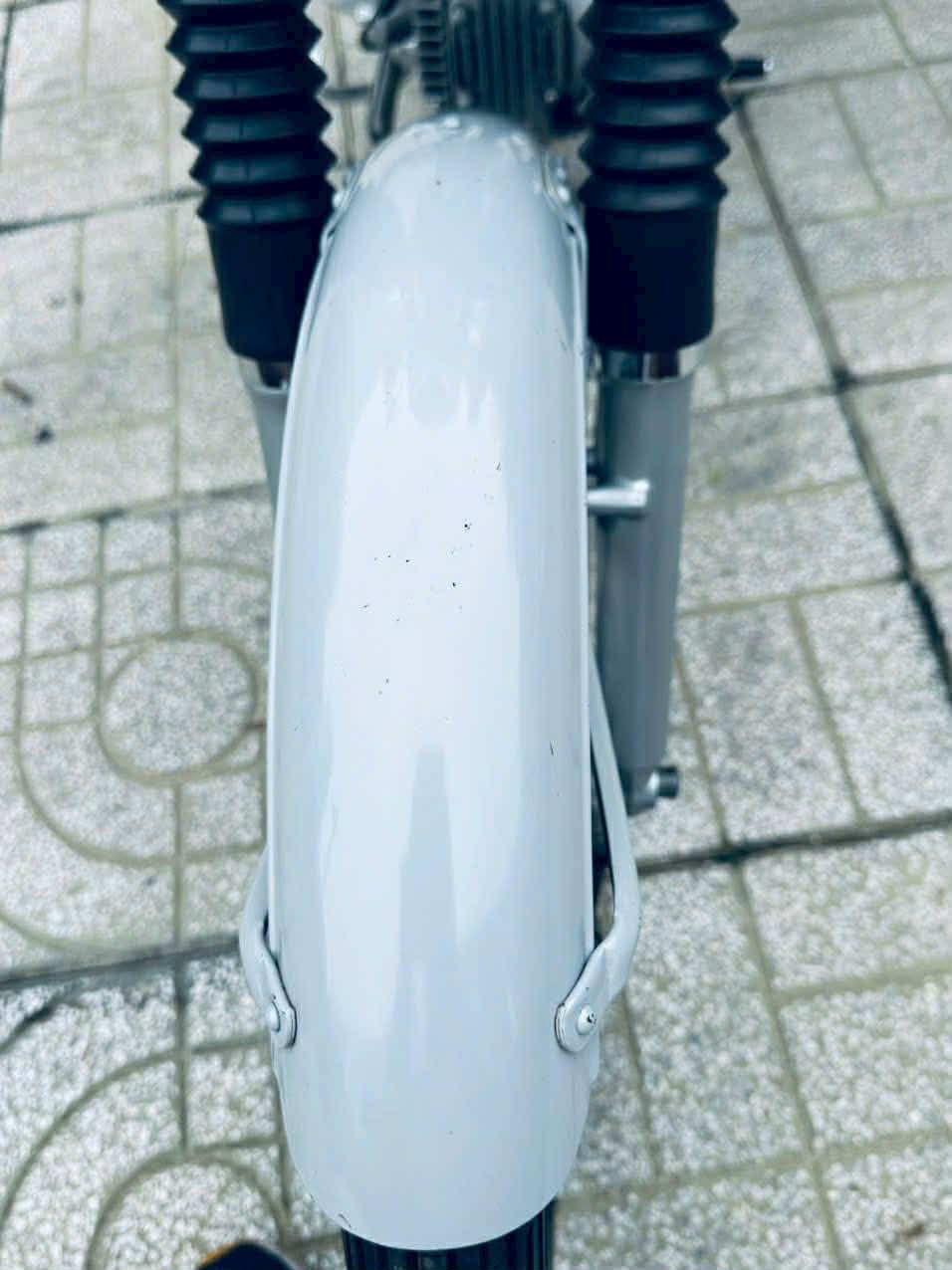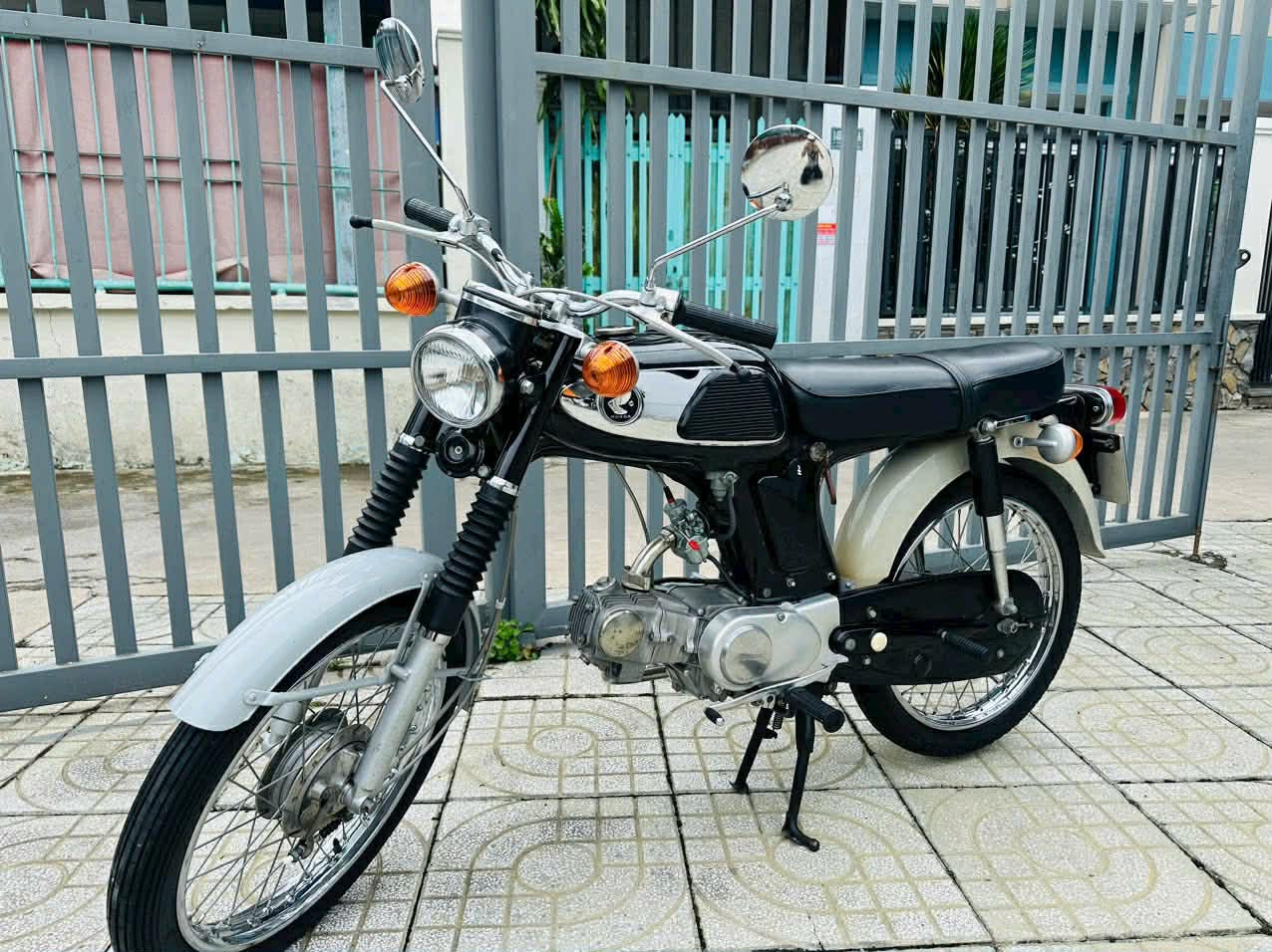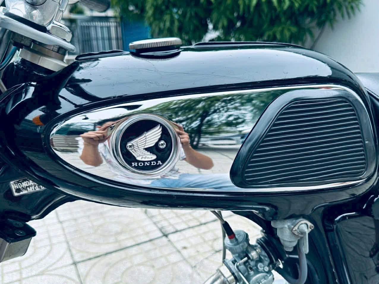 Quan sát từ hình ảnh thực tế, chiếc xe mang màu sơn đen bạc đặc trưng của dòng Honda 67. Bình xăng giọt nước với logo cánh chim vẫn sắc nét, lớp sơn còn khá đều màu theo thời gian. Các chi tiết như dè trước, dè sau, ống xả, vành nan hoa giữ đúng phom dáng nguyên bản.