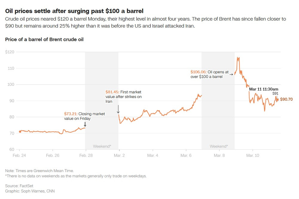 Biến động giá dầu thô trên thế giới kể từ khi xung đột giữa Mỹ, Israel và Iran nổ ra. Ảnh: CNN/Công ty dữ liệu và phần mềm tài chính Factset của Mỹ