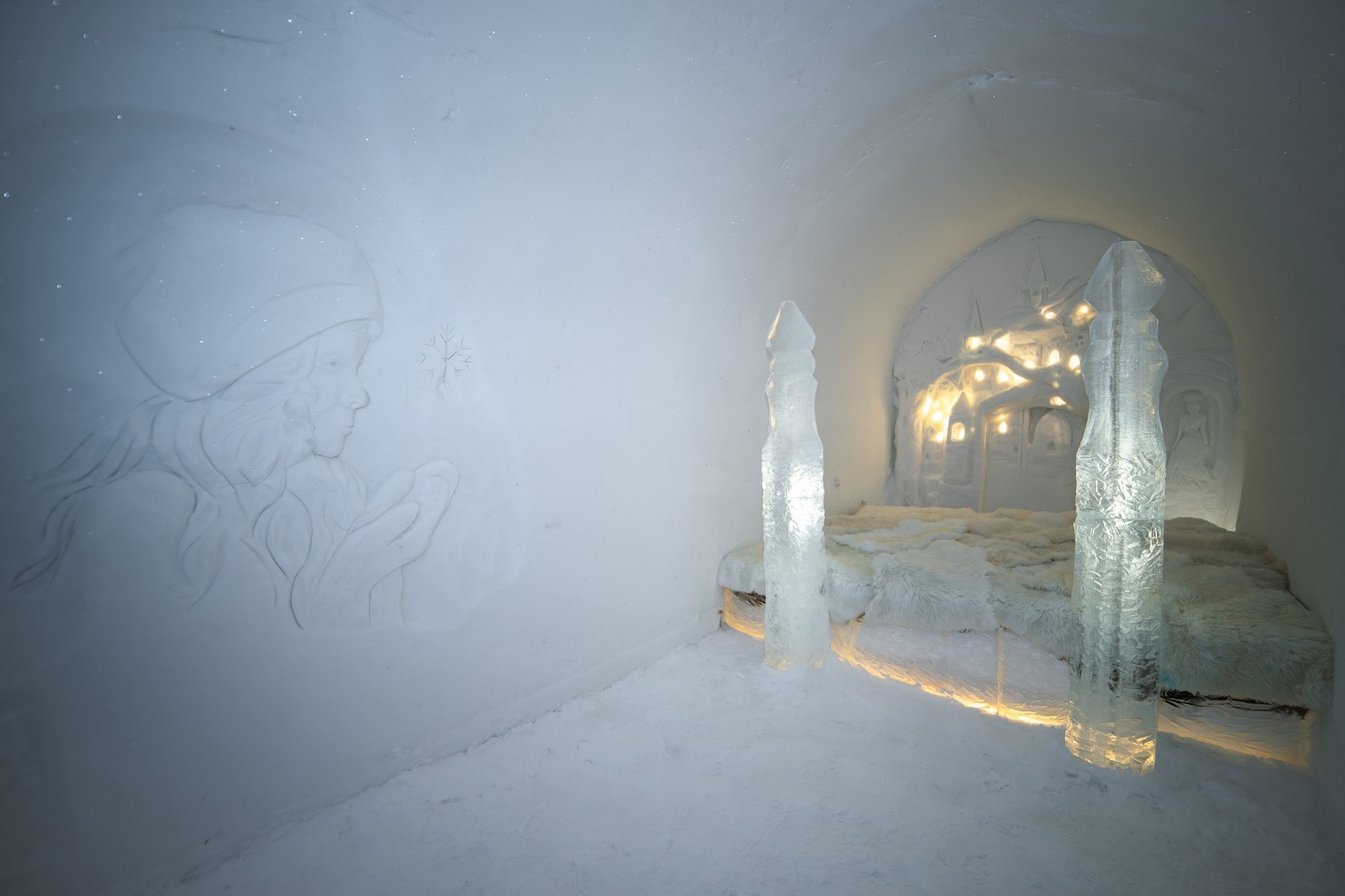 Những chiếc giường được làm hoàn toàn từ băng, bên trên phủ nệm và da tuần lộc nhằm giữ ấm cho du khách suốt đêm.
