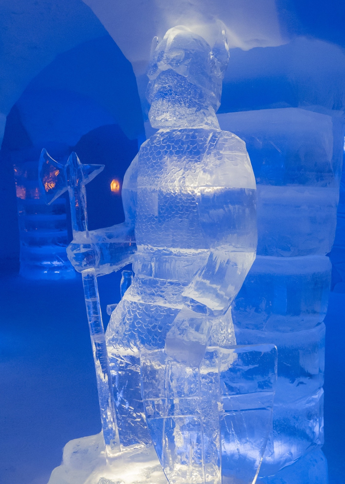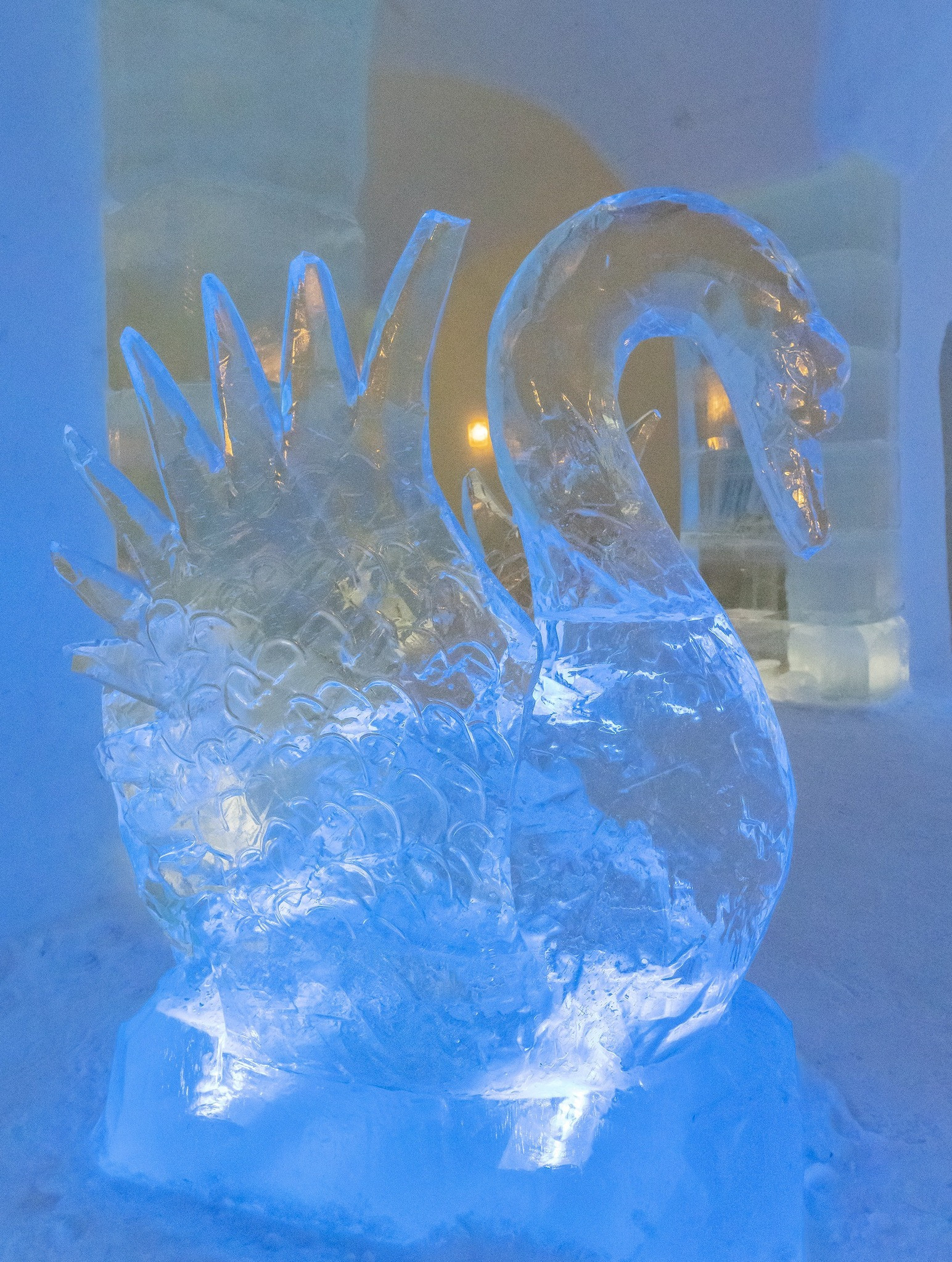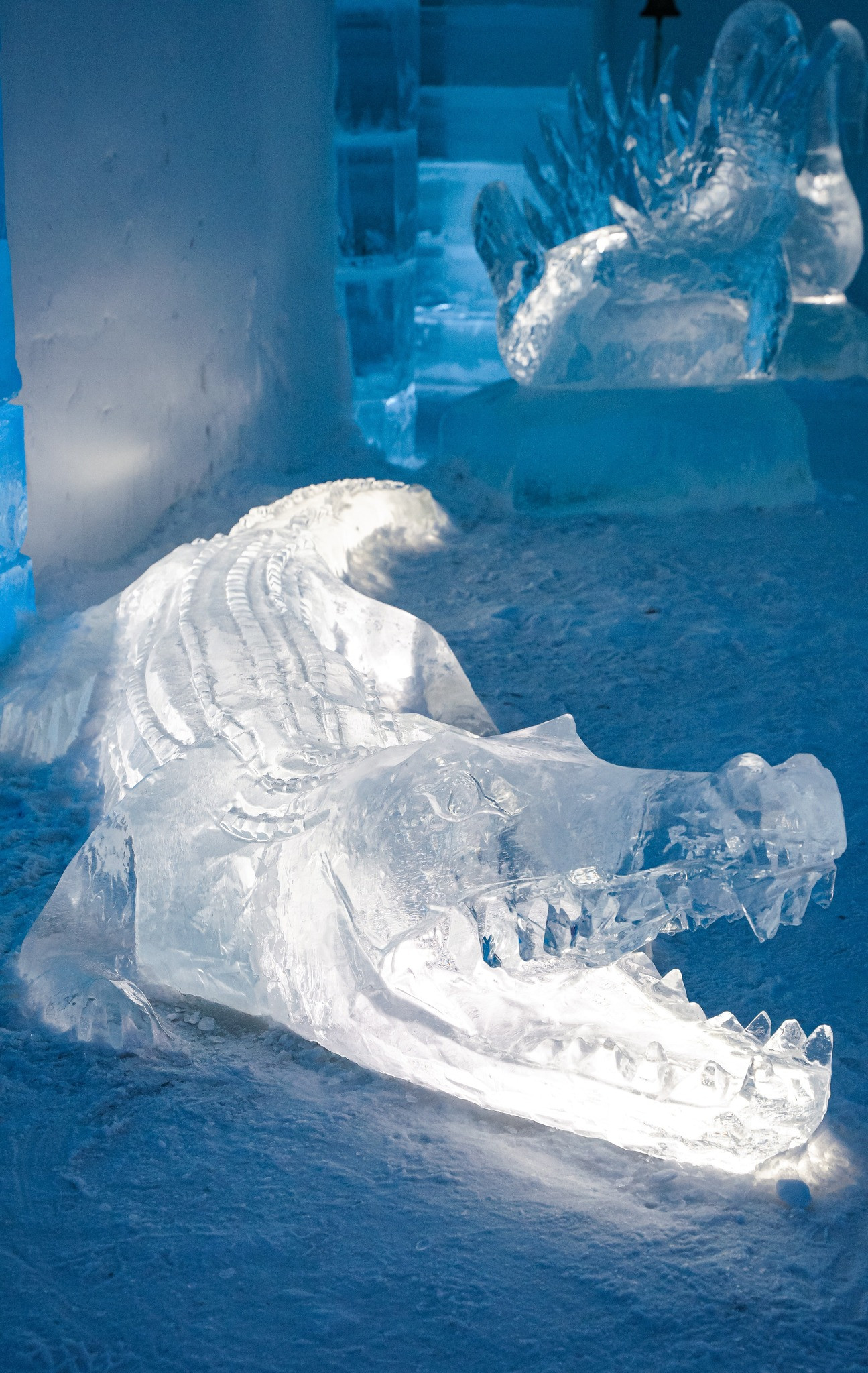 Mỗi phòng mang một chủ đề nghệ thuật riêng, nổi bật với các tác phẩm điêu khắc băng được chạm khắc tinh xảo trên tường, kết hợp ánh sáng xanh dịu nhẹ, tạo nên không gian yên tĩnh, huyền ảo và đậm chất Bắc Cực.