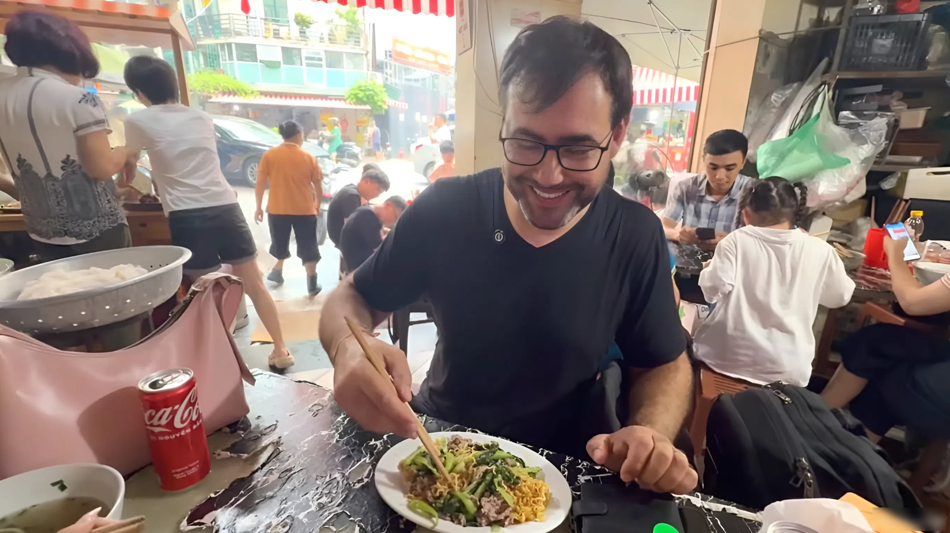 Marcelo tiết lộ lý do chọn dùng bữa ở đây là vì thấy quán nhận được nhiều đánh giá tích cực trên Google. Thậm chí, khi hai vị khách tới nơi, khách đã ngồi gần kín chỗ. Tại đây, Marcelo và Andranna gọi 2 suất mì xào bò, giá 60.000 đồng/suất.