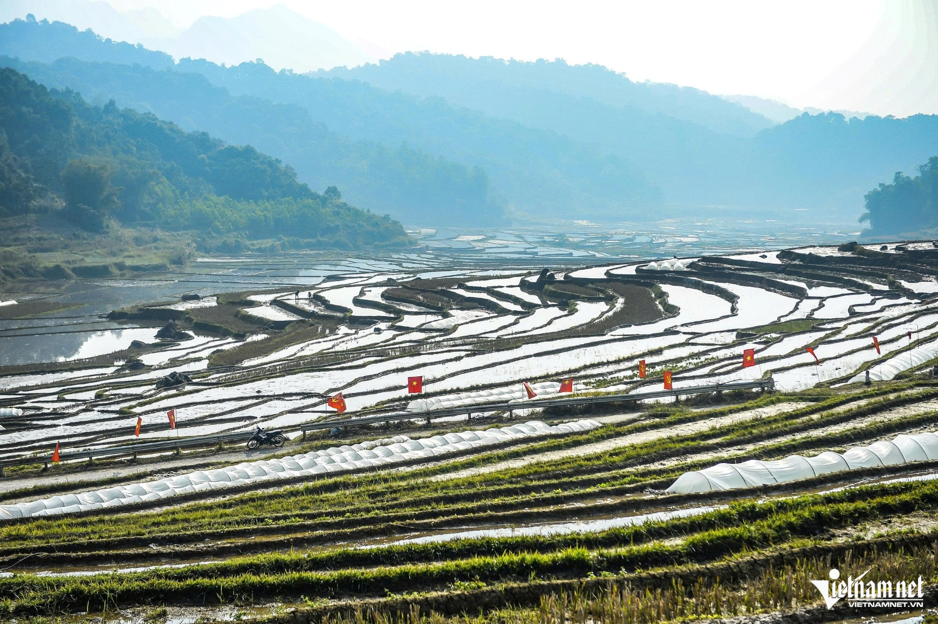 Những ngày cuối năm âm lịch, người dân các bản làng ở Pù Luông bắt đầu dẫn nước về ruộng để chuẩn bị cấy lúa. Từ trên cao nhìn xuống, các thửa ruộng uốn lượn mềm mại theo triền núi, phản chiếu bầu trời, mây trắng và những mái nhà sàn thấp thoáng, tạo nên khung cảnh vừa hùng vĩ, vừa thơ mộng.