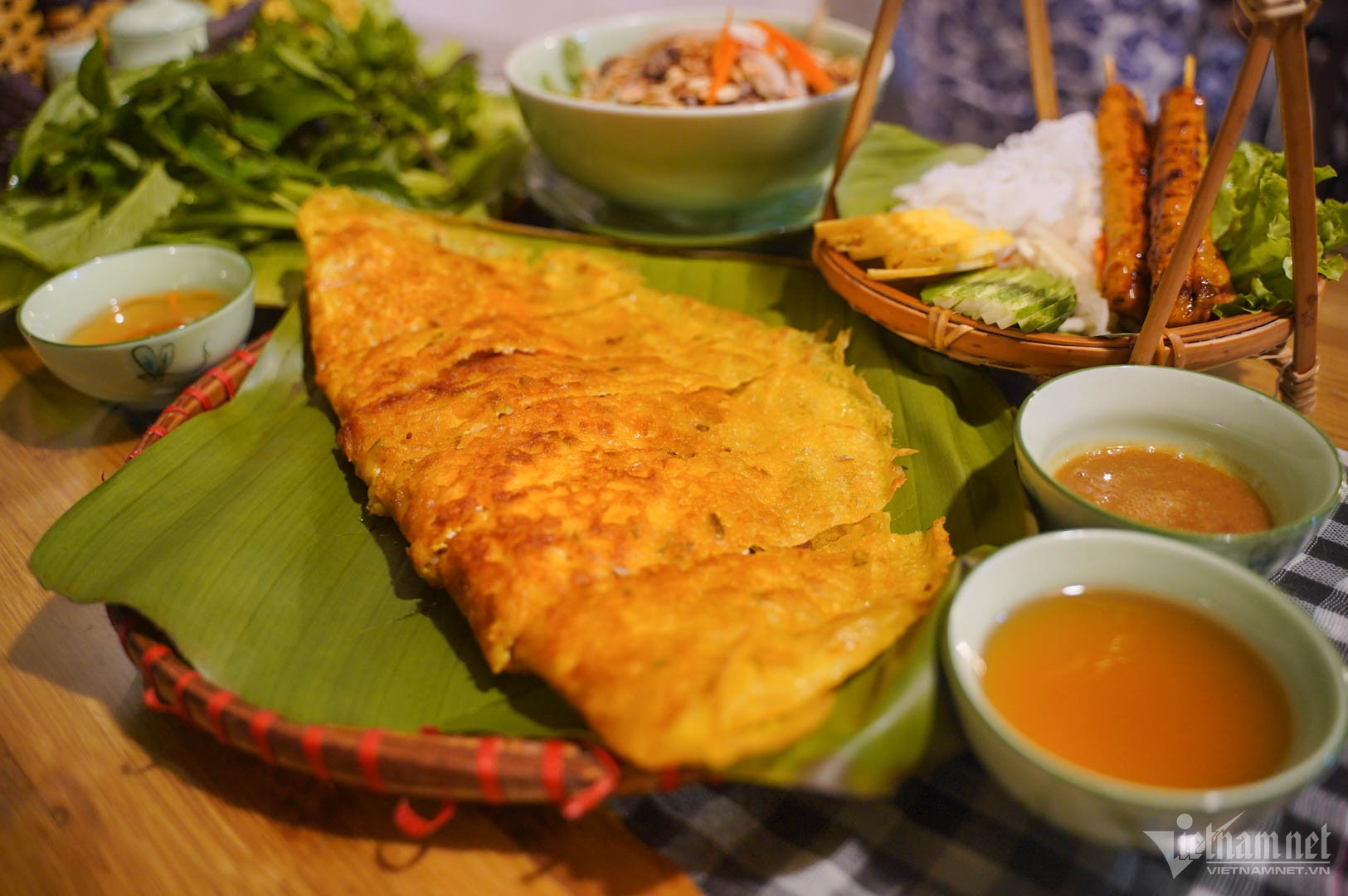 Cô ngạc nhiên với rổ rau sống ăn kèm siêu phong phú, tươi rói với đủ loại như xà lách, bạc hà, tía tô, kinh giới... Nhiều loại rau trong đó nữ du khách không thể phân biệt tên. Nhân bánh đầy đặn với tôm, mực và thịt cá.