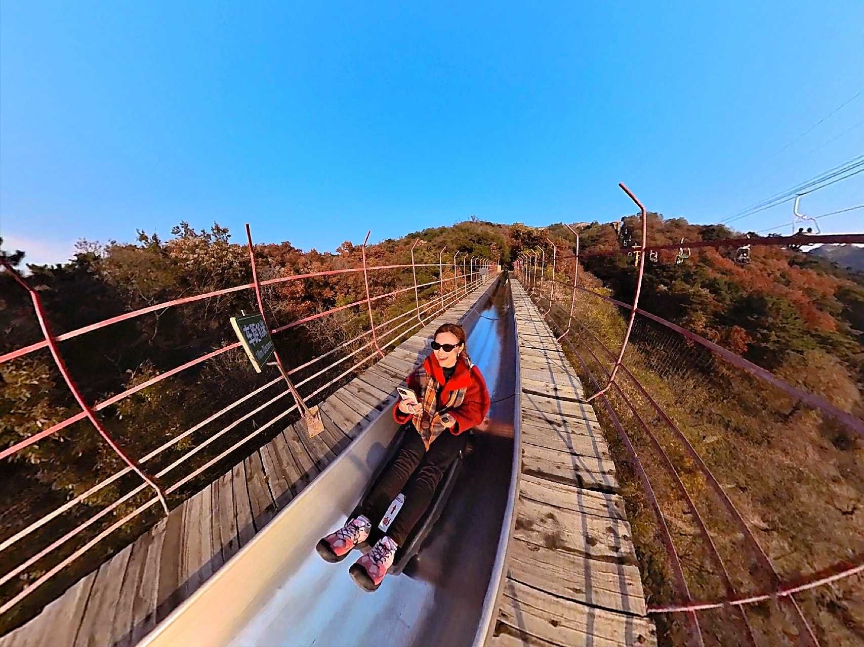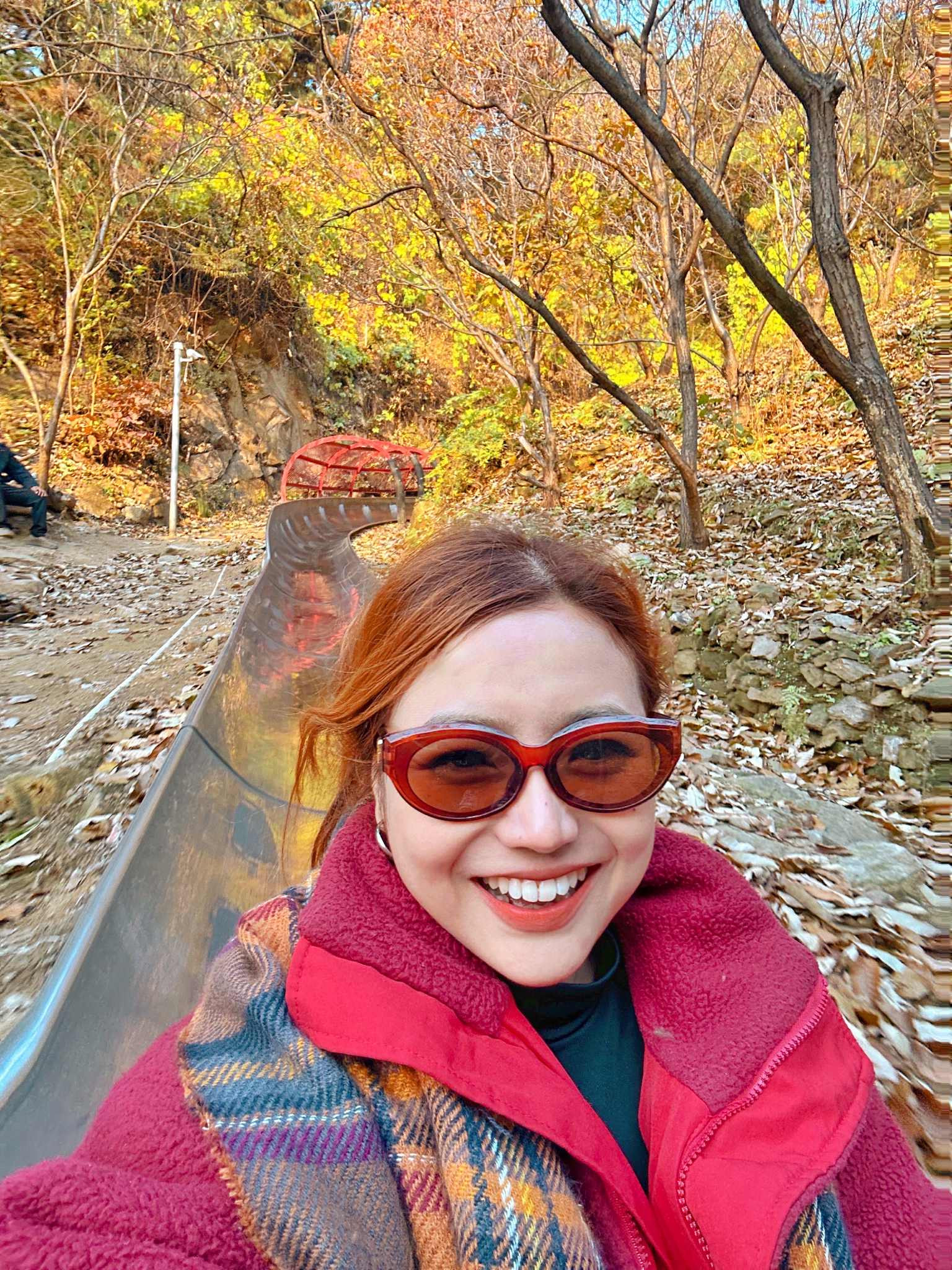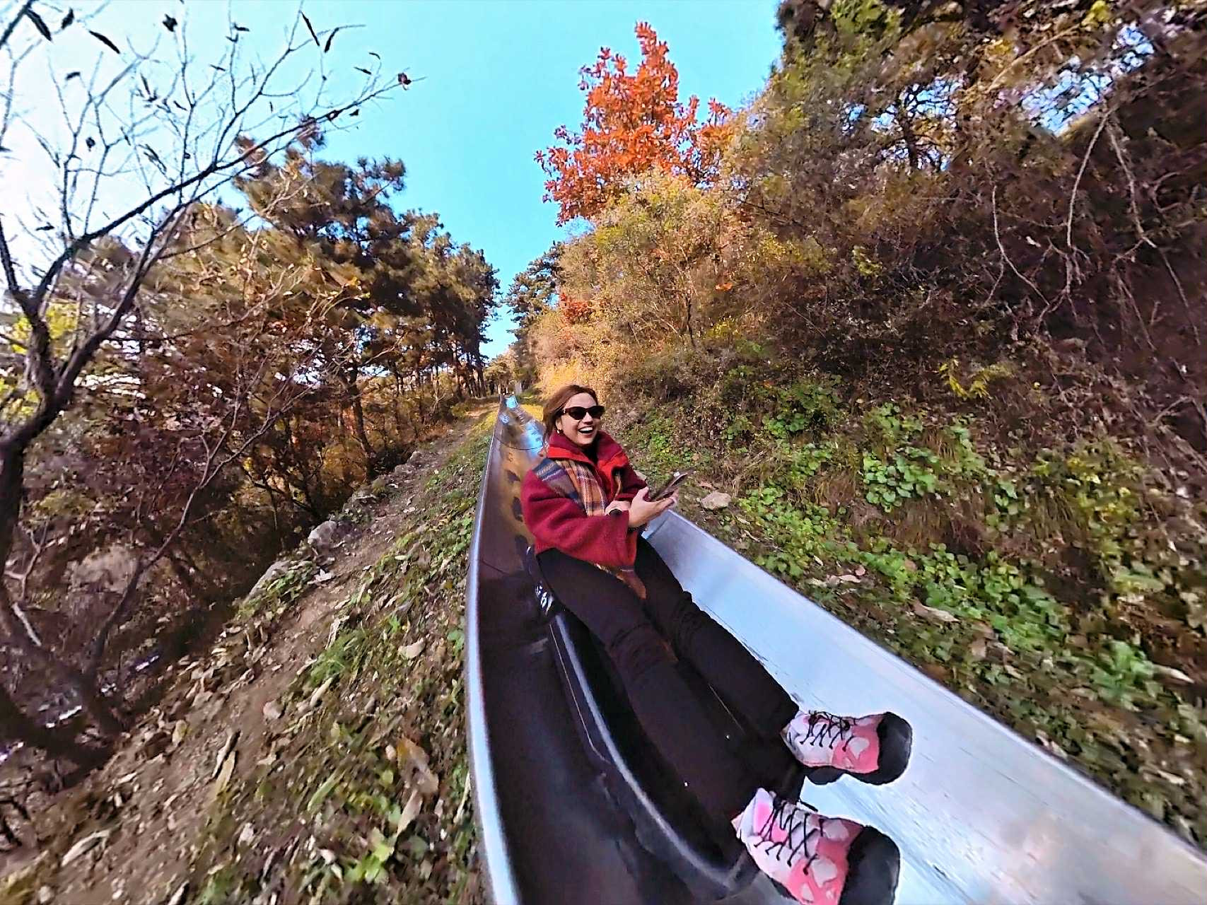 Nữ du khách đến từ TPHCM phấn khích vì vừa trượt vừa được ngắm khung cảnh lá vàng, lá đỏ lãng mạn