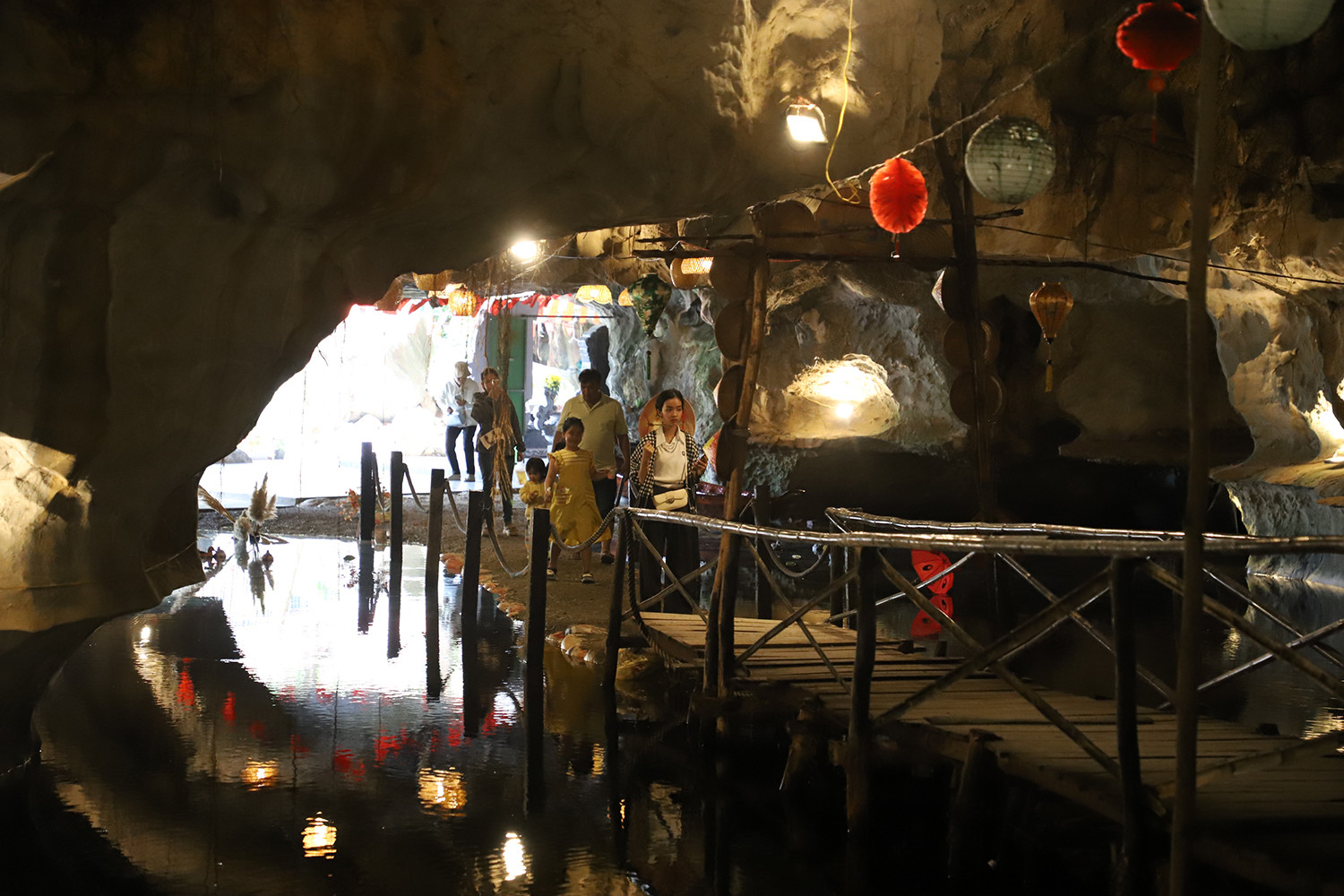Dưới ánh sáng mờ ảo hắt xuống từ các khe đá, những cụm thạch nhũ óng ánh tạo nên cảnh tượng huyền ảo, khiến người ta có cảm giác như lạc vào một thế giới cổ tích.