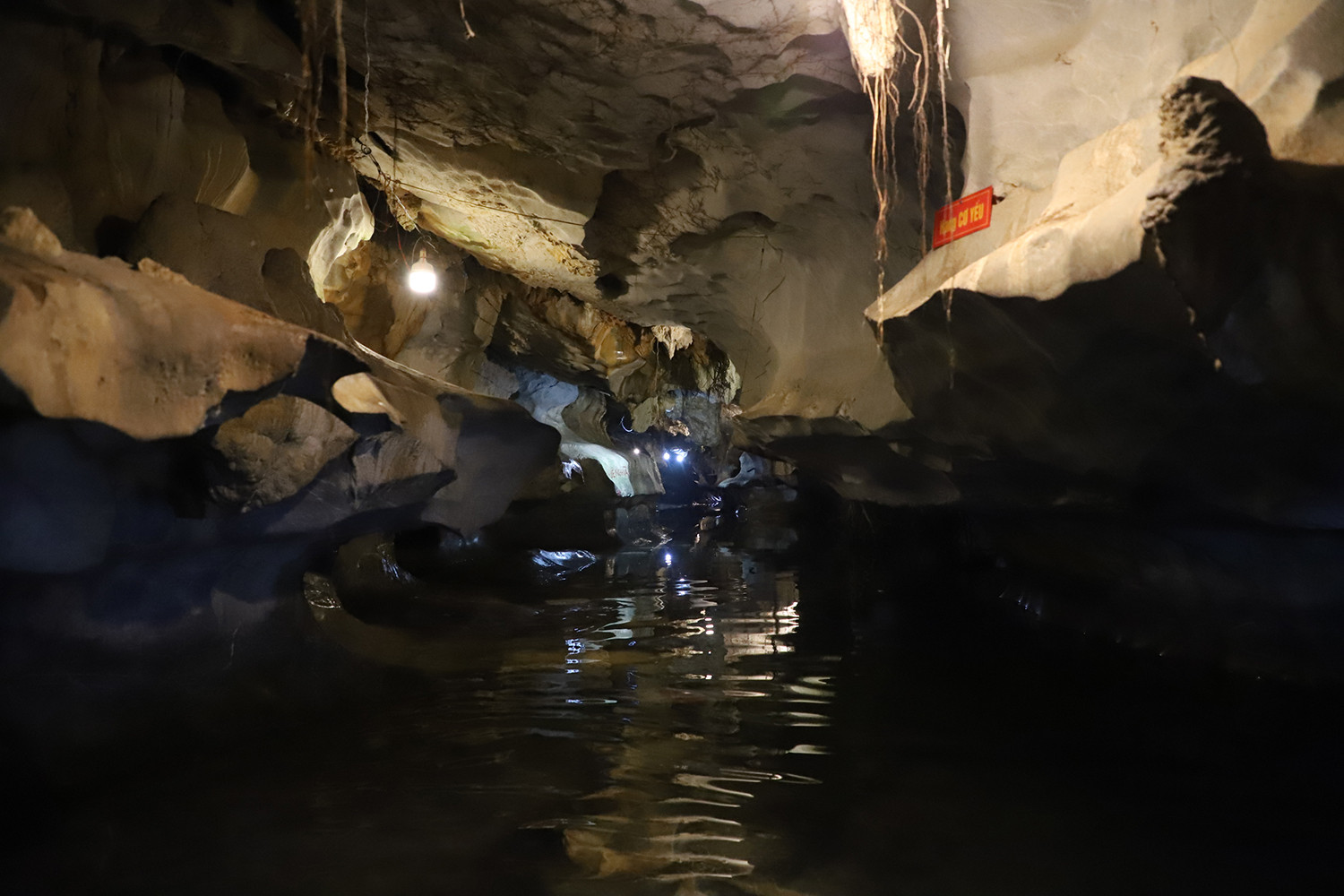 Dòng suối ngầm mát lạnh uốn lượn trong hang Cơ yếu. Ảnh: T.T
