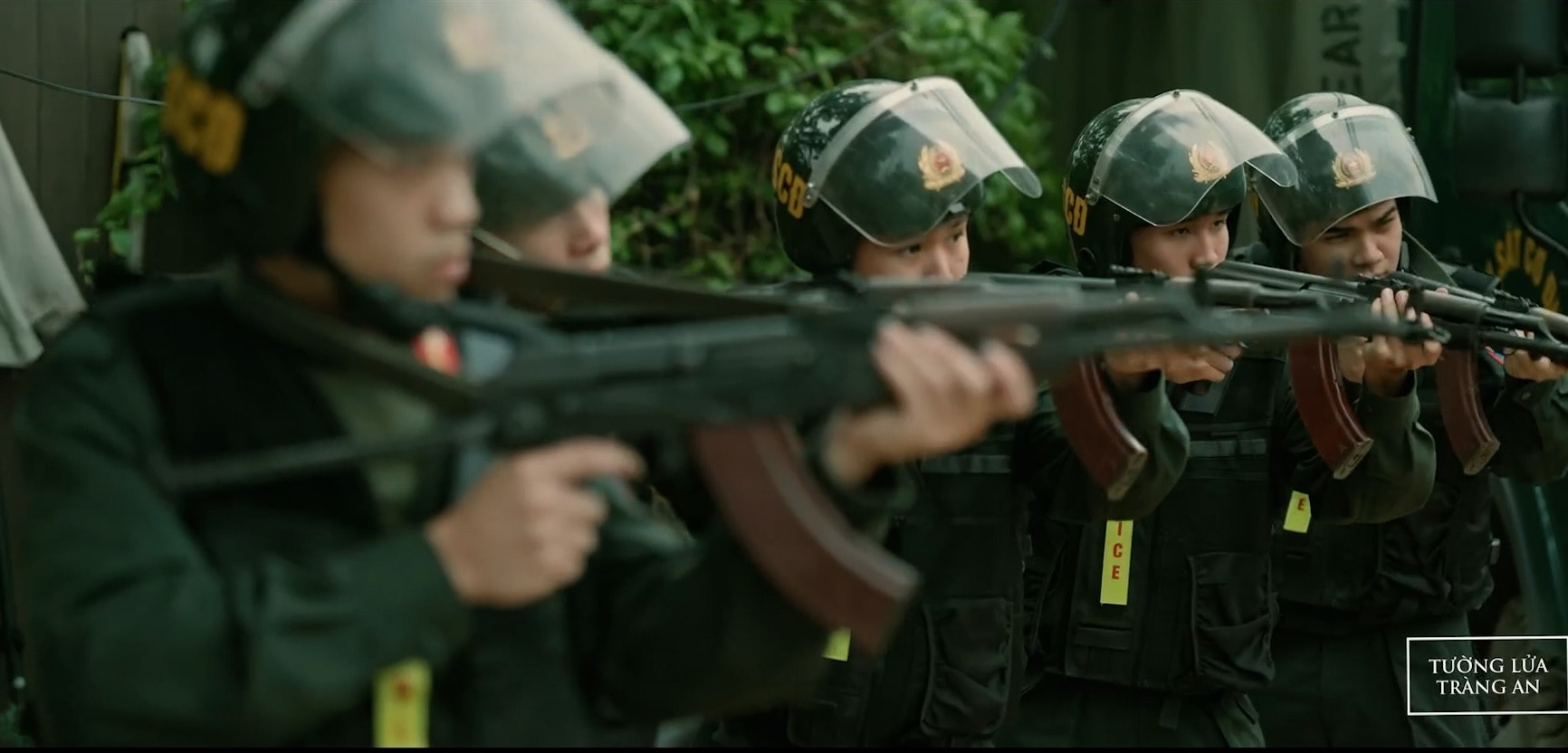 Lực lượng cảnh sát cơ động tham gia một cảnh quay.