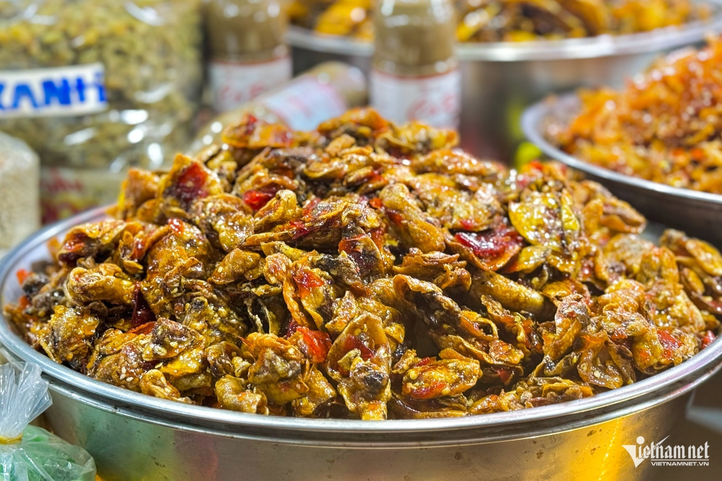 Nổi bật nhất ở tầng 1 là hàng chục gian hàng bán mắm, với đủ các loại mắm ruốc, mắm cà, mắm cá rò, tôm chua, mực rim mắm, cá rim...