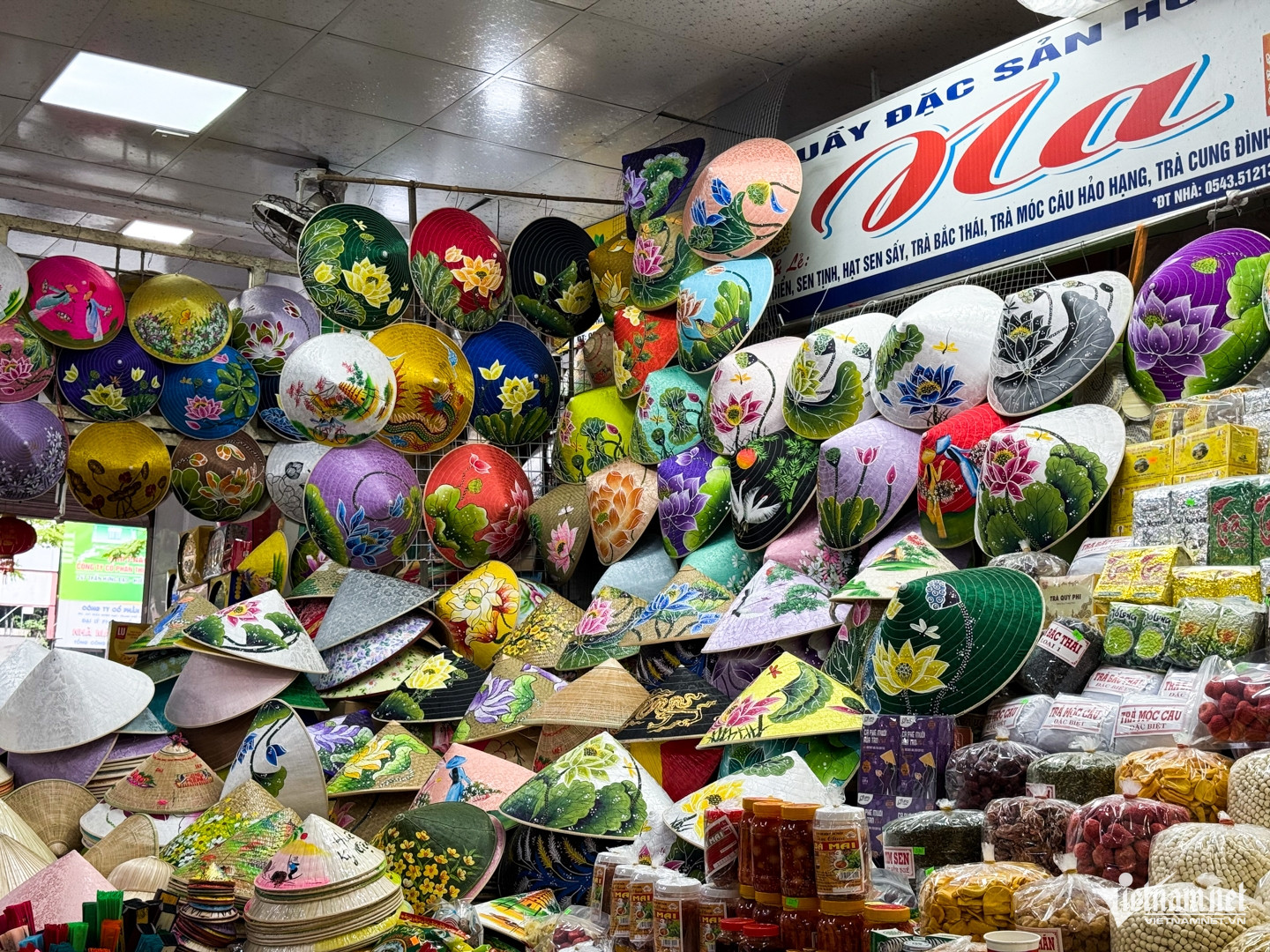 Những chiếc nón bài thơ cũng được bày bán trong chợ với nhiều chất liệu và kiểu dáng, mỗi chiếc có giá từ 50.000 - 150.000 đồng. Du khách cũng có thể mua những món đồ khô như hạt sen, kẹo mè sửng... tại chợ để làm quà.