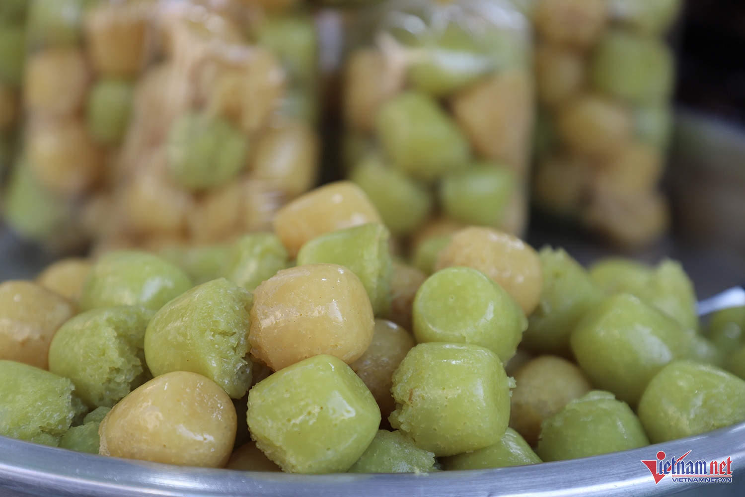 Giữa muôn vàn món ăn, bánh tét phiên bản tí hon là thứ khiến nhiều du khách phải tò mò. Vẫn là những nguyên liệu quen thuộc nhưng bánh được thu nhỏ chỉ bằng ngón tay, buộc thành từng chùm gọn gàng.