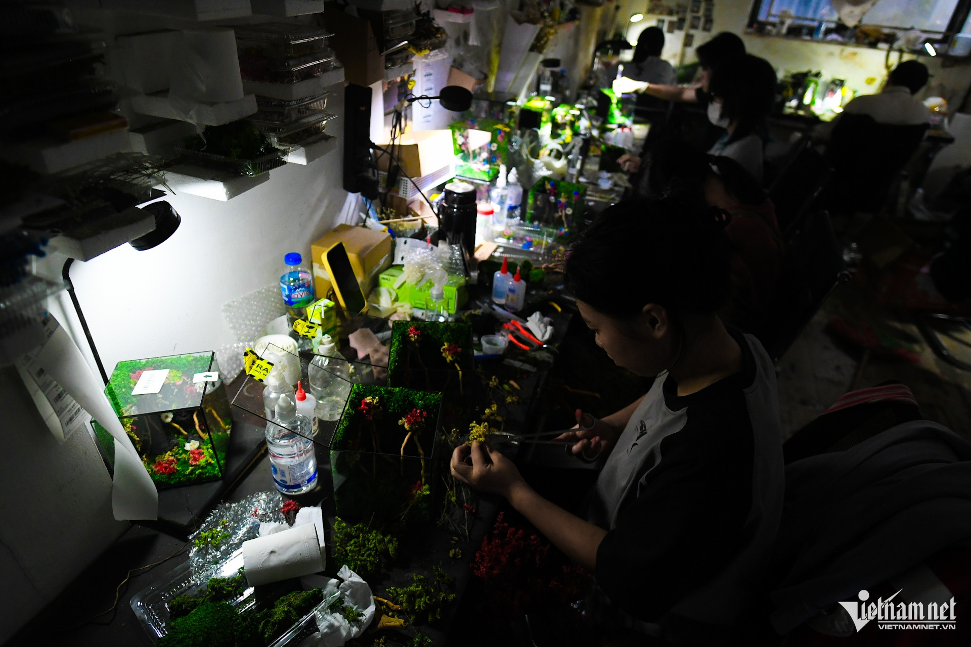Sau khi tạo bố cục (layout) cho các hộp quà, nhân viên sản xuất sử dụng các loại cây, hoa được sấy khô: rêu trắc bá, rêu cushion, rễ cây hoàng cuông... để tạo dựng mô hình sống động bên trong. Các sản phẩm này sau khi hoàn thiện sẽ được định hình và đóng kín hoàn toàn.