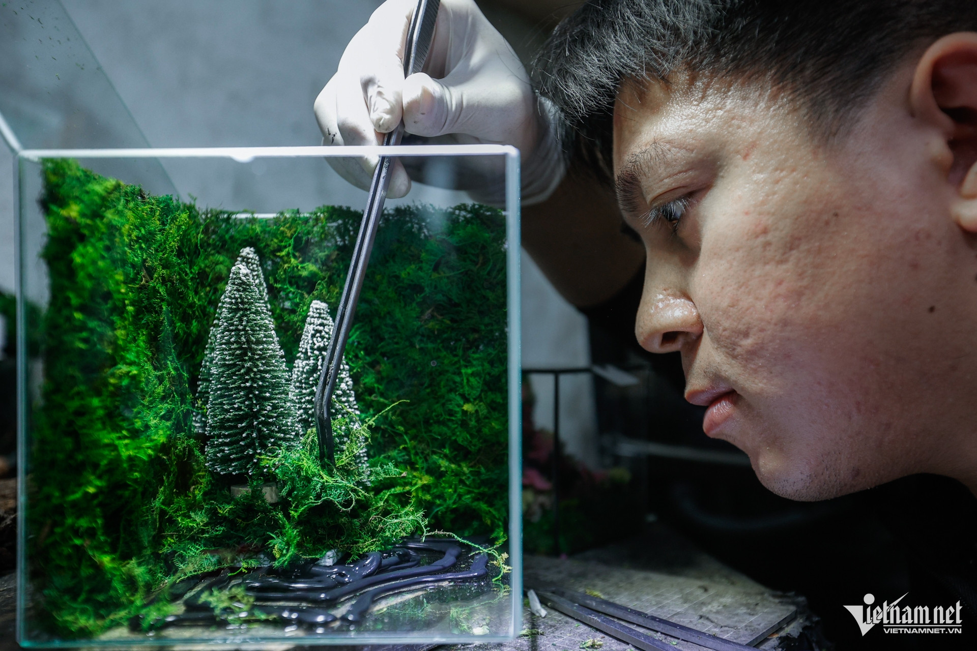 Anh Nguyễn Quốc Trường cho biết, khác với terrarium truyền thống, bể thủy tinh của cơ sở làm ra sẽ không cần tưới nước, không cần đất trồng hay ánh sáng. "Các sản phẩm sử dụng một dòng rêu bảo tồn riêng là rêu thật từ thiên nhiên. Sau khi khai thác, chọn lọc và trải qua quá trình xử lý đặc biệt, sản phẩm có thể 'đóng băng' ở trạng thái tươi mới như thật", anh nói.
