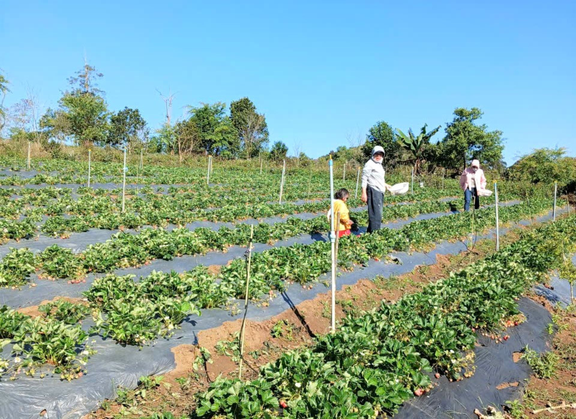 Khách du lịch tìm đến vườn của ông A Phố để trải nghiệm làm nông và tự tay hái những quả dâu tây chín mọng