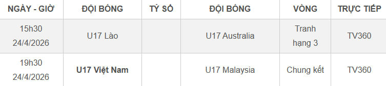 Lịch thi đấu U17 Đông Nam Á 2026 - Cập nhật lịch thi đấu trận chung kết và tranh hạng 3 Giải vô địch U17 Đông Nam Á 2026, đầy đủ và chính xác.
