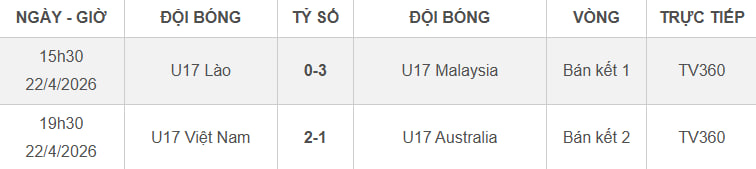 Lịch thi đấu và kết quả vòng bán kết U17 Đông Nam Á 2026