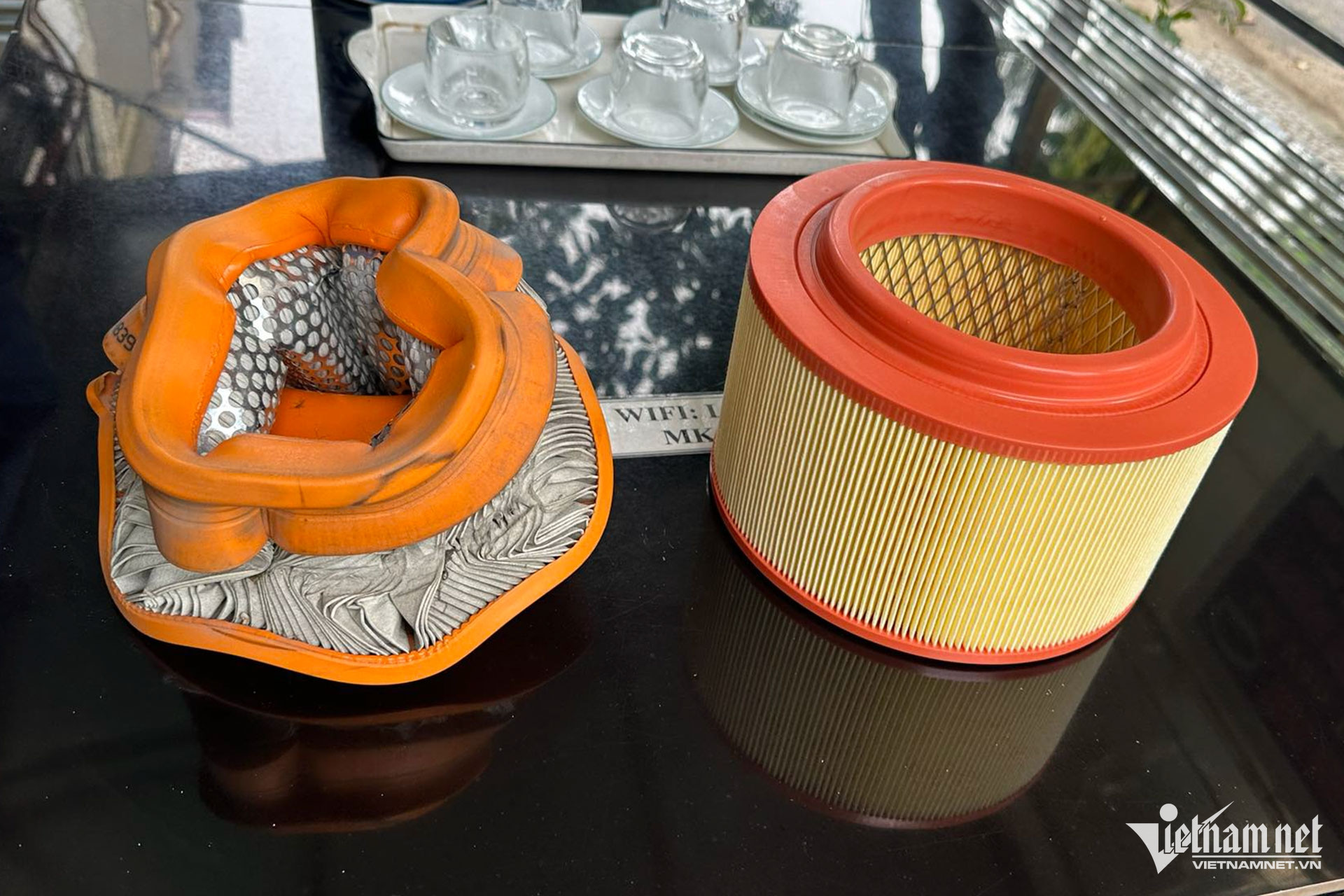 Đem so sánh với lọc gió chính hãng chuẩn bị lắp mới, sự khác biệt rõ rệt về chất lượng của bộ lọc gió cũ khiến chủ xe thực sự "sốc".