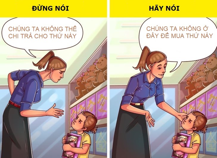 “Hãy đồng ý rằng chúng ta sẽ chỉ mua quà mỗi tuần một lần”. Bằng cách đó, trẻ sẽ dễ dàng chấp nhận việc đợi đến ngày được mua quà. Lời từ chối này dạy trẻ tính kiên nhẫn và đặt ra các mục tiêu, bao gồm cả mục tiêu tài chính và lập kế hoạch cách tiến tới mục tiêu đó.