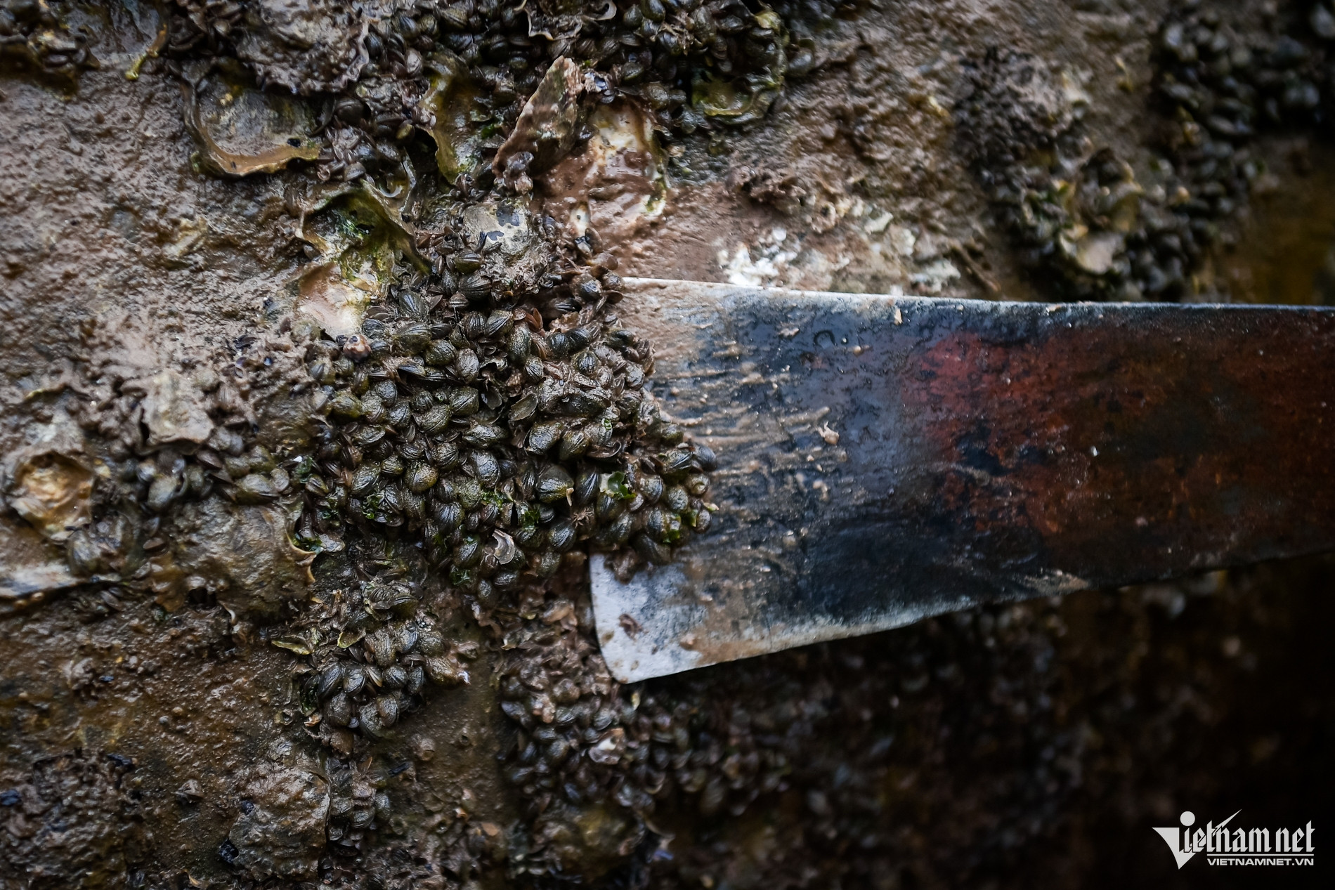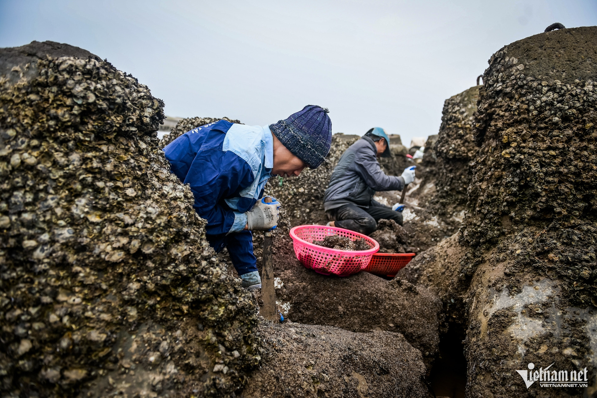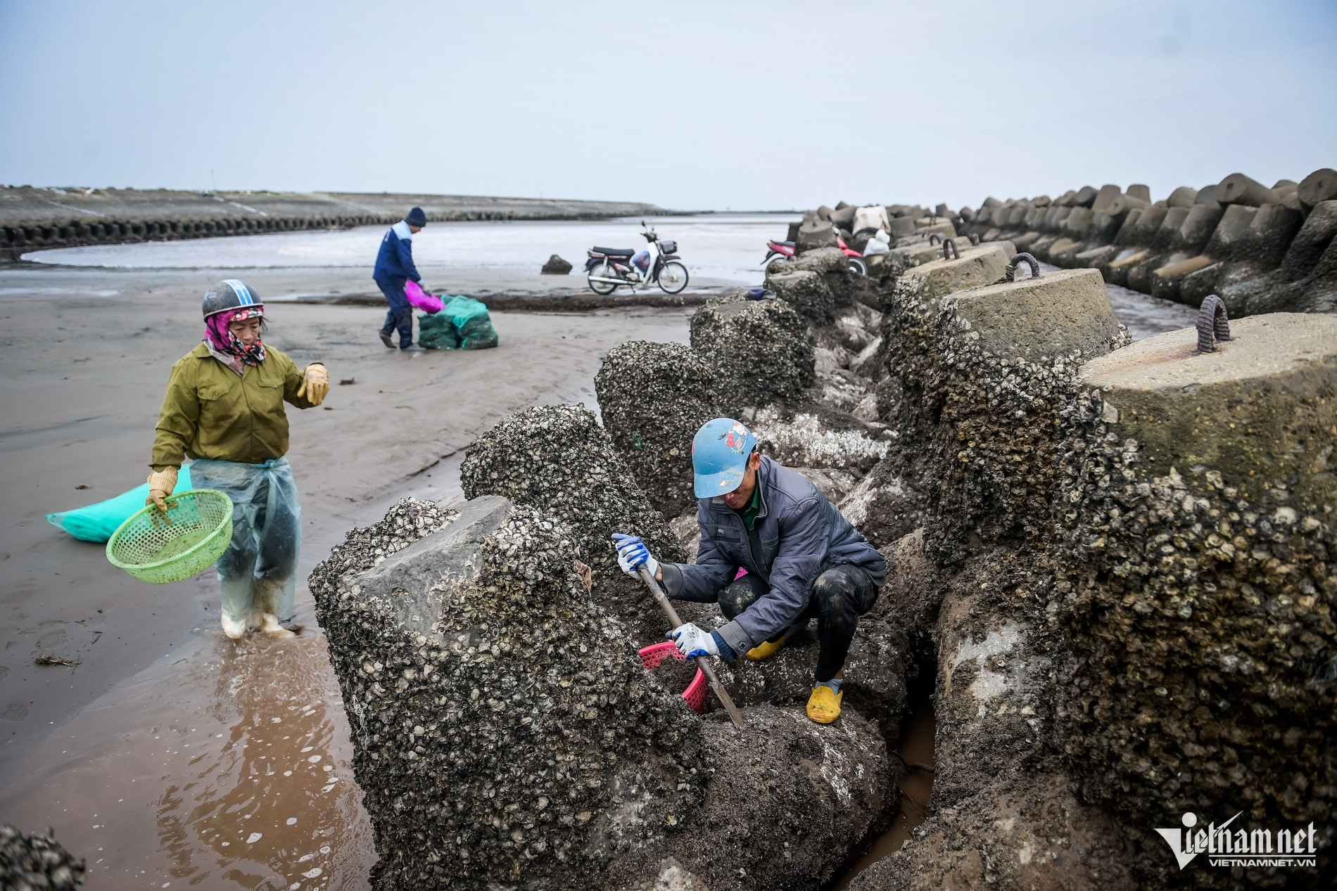 Trên bãi triều mênh mông, gió biển thổi buốt mặt, nước biển mùa đông lạnh ngắt khiến mũi ai nấy đều đỏ hoe, đôi chân tê dại. Để tránh gió lạnh, nhiều người khoác thêm áo mưa mỏng, quấn vội chiếc khăn cũ, cúi gập người, tay thoăn thoắt cạy từng mảng vẹm bám chặt trên các khối bê tông.