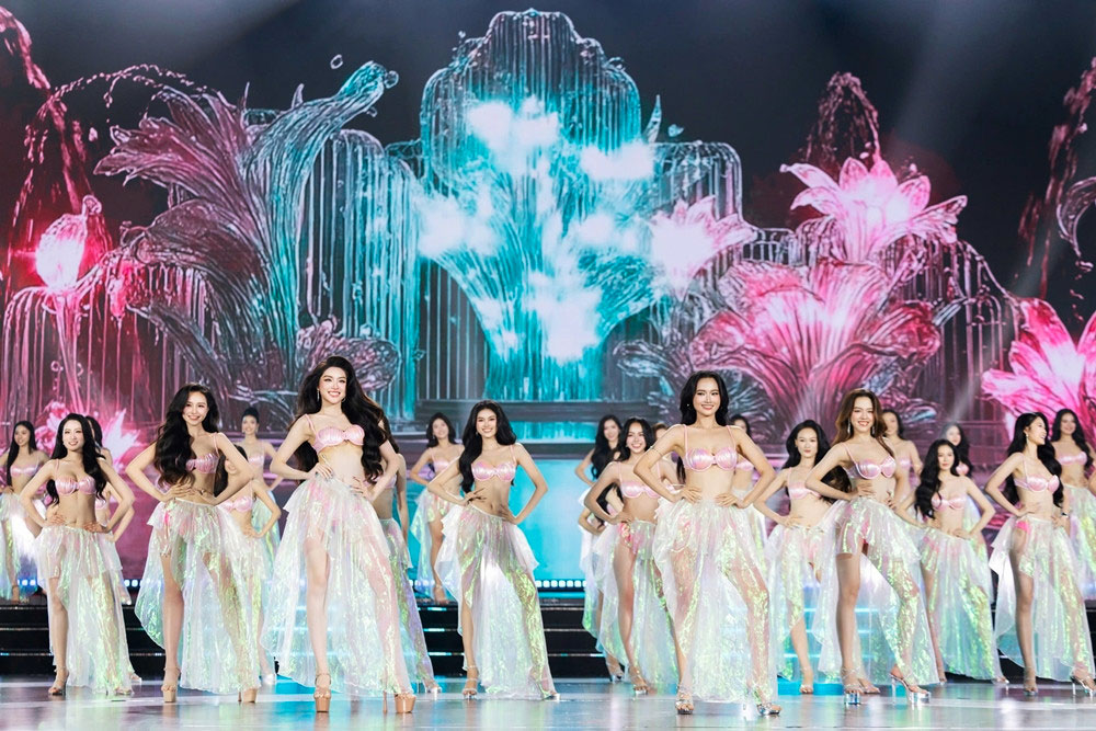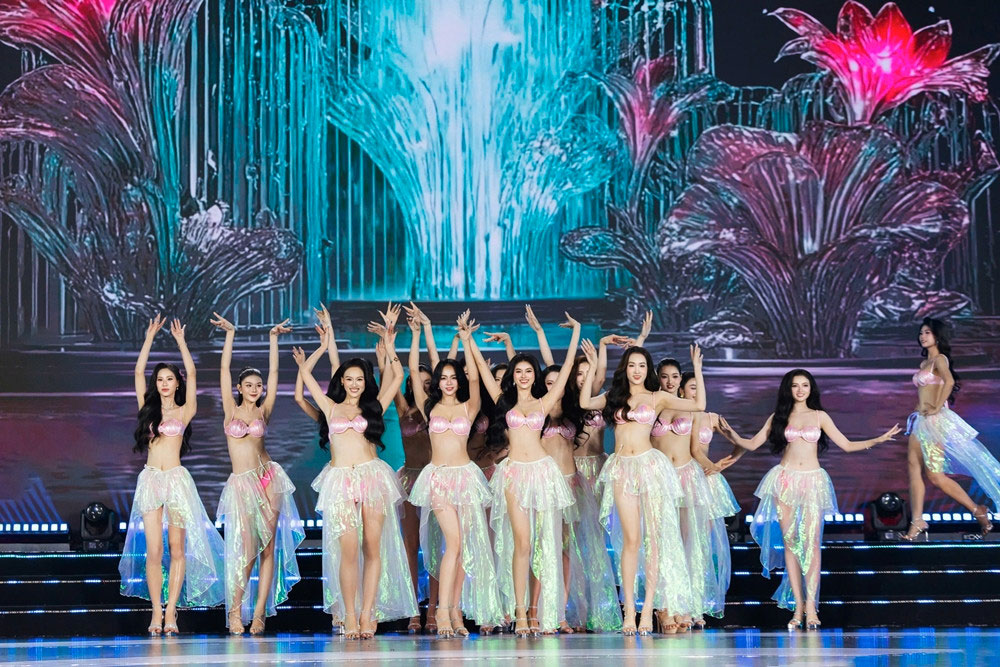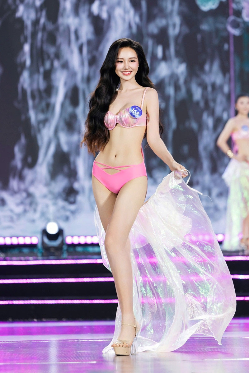 Top 20 diện trang phục bikini hồng pastel kết hợp chân váy voan ánh kim, tôn lên vóc dáng và thần thái của từng thí sinh dưới hệ thống ánh sáng chuyên nghiệp. Các thí sinh tự tin di chuyển, tạo hình và tương tác cùng nhau trên sân khấu giữa tiếng hò reo không ngớt của khán giả.