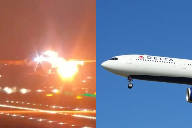 Máy bay hãng hàng không Delta Air Lines bốc cháy sau khi cất cánh. Ảnh: Mirror