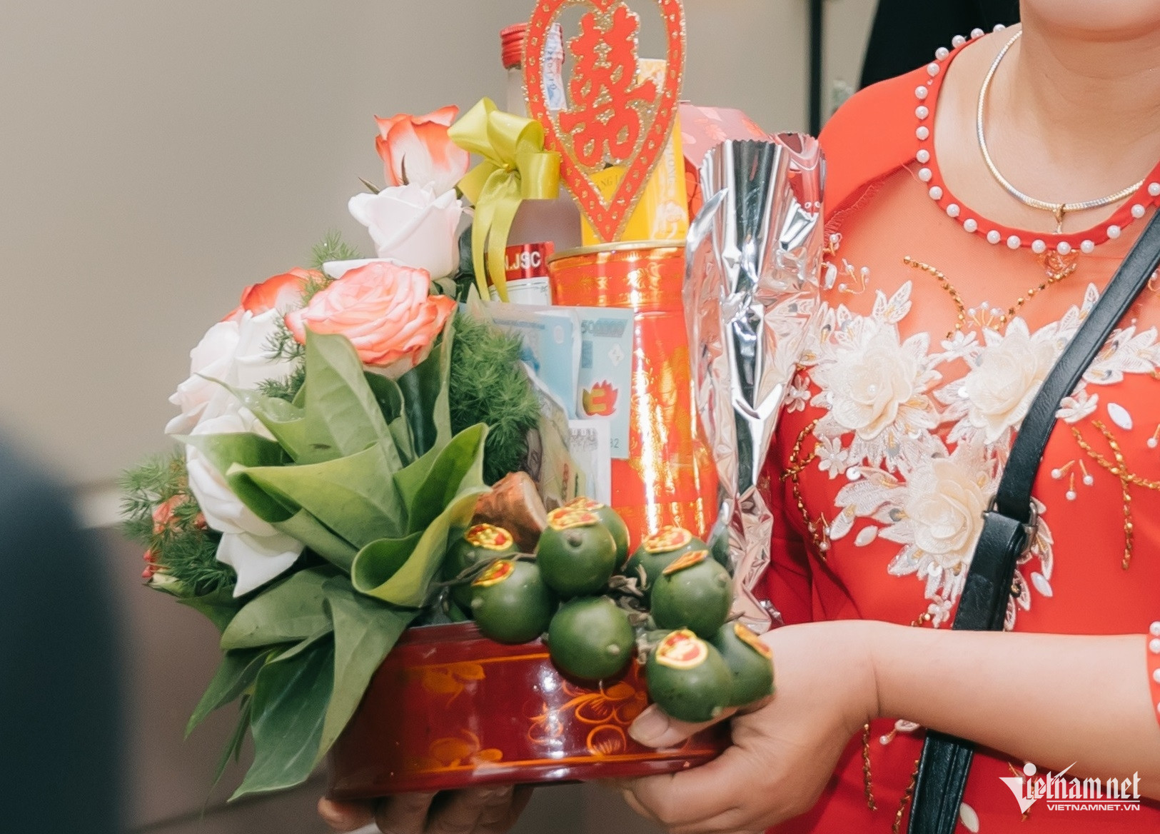 Ngày làm lễ ăn hỏi và xin dâu gộp chung, tổ chức trong 2 ngày, hôm trước là ăn hỏi, hôm sau là xin dâu. Hôm ăn hỏi, nhà trai tới khá đông và mang 9 mâm tráp cưới. Mẹ chồng trao sính lễ cho gia đình tôi. Vì sau đó, hai nhà di chuyển ra trung tâm tiệc cưới nên mẹ đẻ tôi cất sính lễ vào két chứ không kiểm tra.