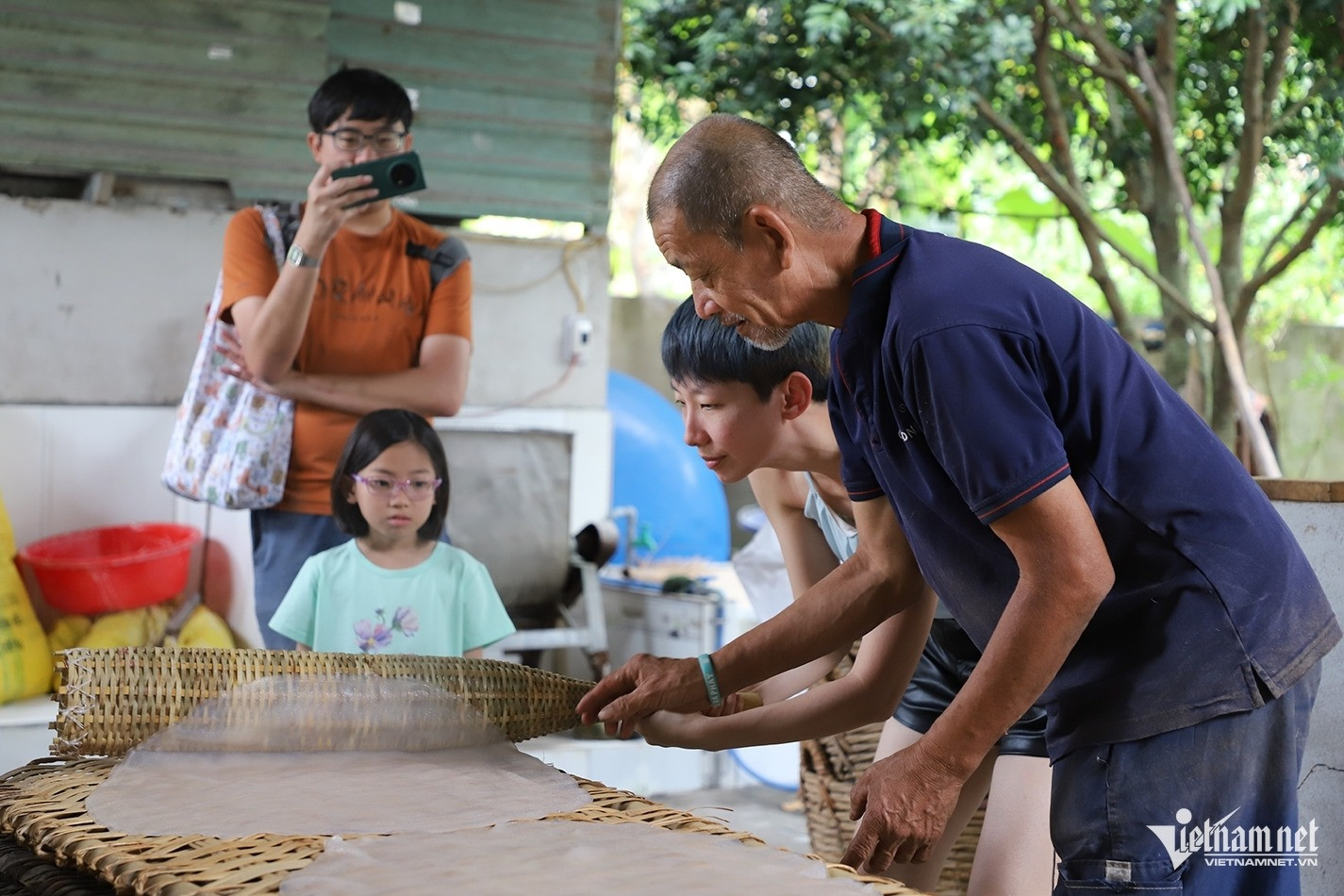 Gia đình du khách Singapore trải nghiệm quy trình làm hủ tiếu