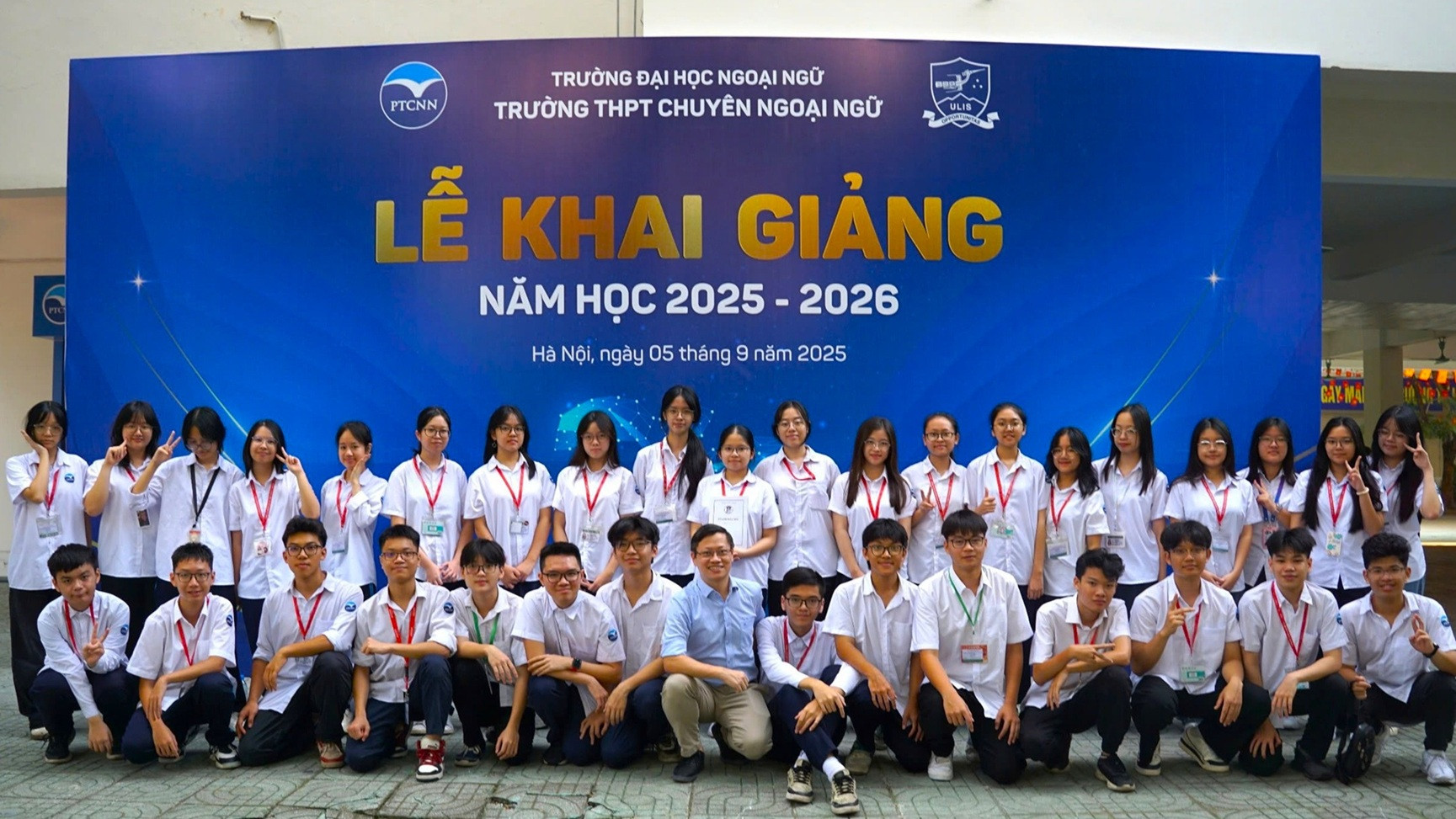 Thầy Nguyễn Phi Điệp cùng tập thể lớp 11A9 của Trường THPT Chuyên Ngoại ngữ. Ảnh: NVCC