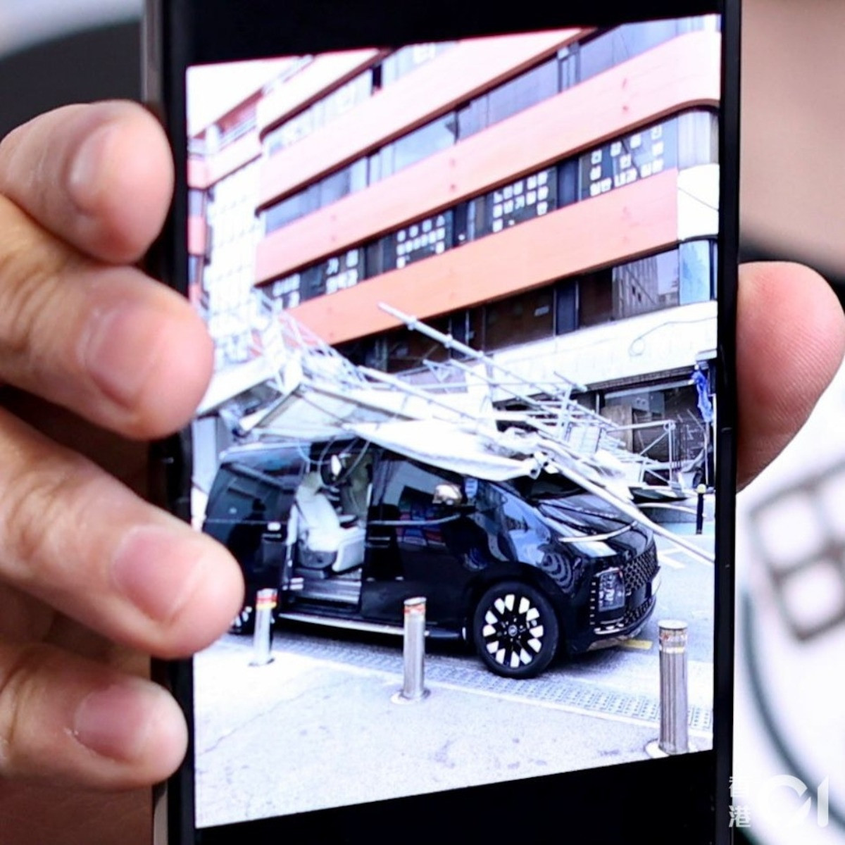 Hình ảnh hiện trường cho thấy giàn giáo đổ sập hoàn toàn lên xe, khiến phương tiện hư hỏng nặng. Trương Kính Hiên cho biết chiếc xe gần như bị phá hủy, trong khi người bạn đi cùng cũng may mắn không gặp nạn do đã rời khỏi xe trước đó.