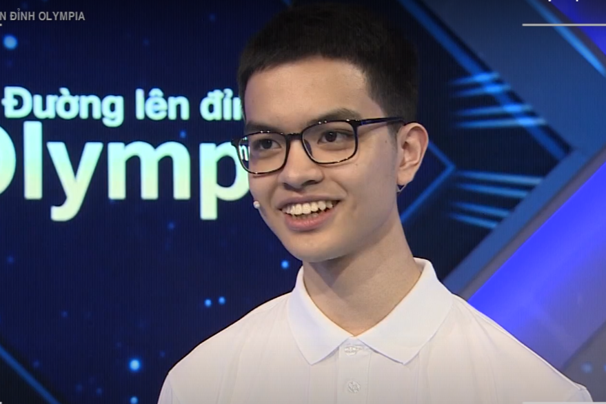 Bành Gia Huy (học sinh Trường Phổ thông liên cấp Greenfield, Hưng Yên) mang theo tấm Huy chương Vàng SEA Games đến đấu trường Đường lên đỉnh Olympia. Ảnh chụp màn hình