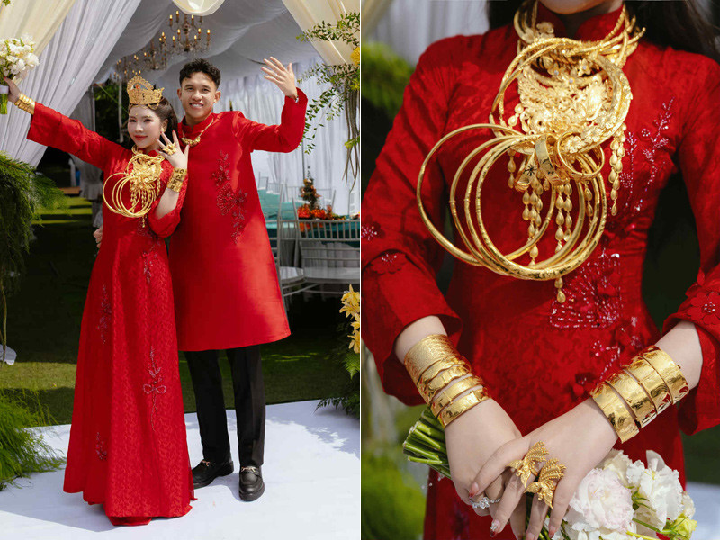 Trong số các món quà nhà gái trao tặng, chiếc dây chuyền kim cương được thiết kế để tặng riêng cho chú rể Minh Khoa mang ý nghĩa đặc biệt.