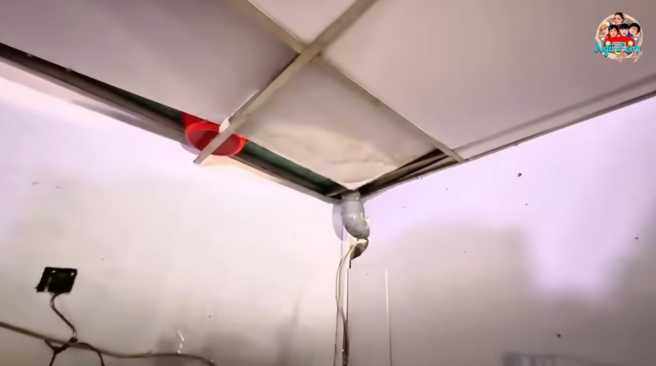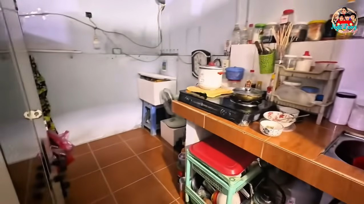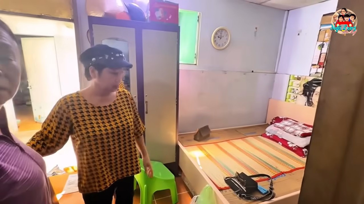 Không giang sống chật hẹp của nghệ sĩ Phụng Nghi, nơi đồ ve chai chất đầy trong nhà, mái tôn mục nát để chậu hứng nước giột khi trời mưa. Con gái bà ngủ trong gian bếp.