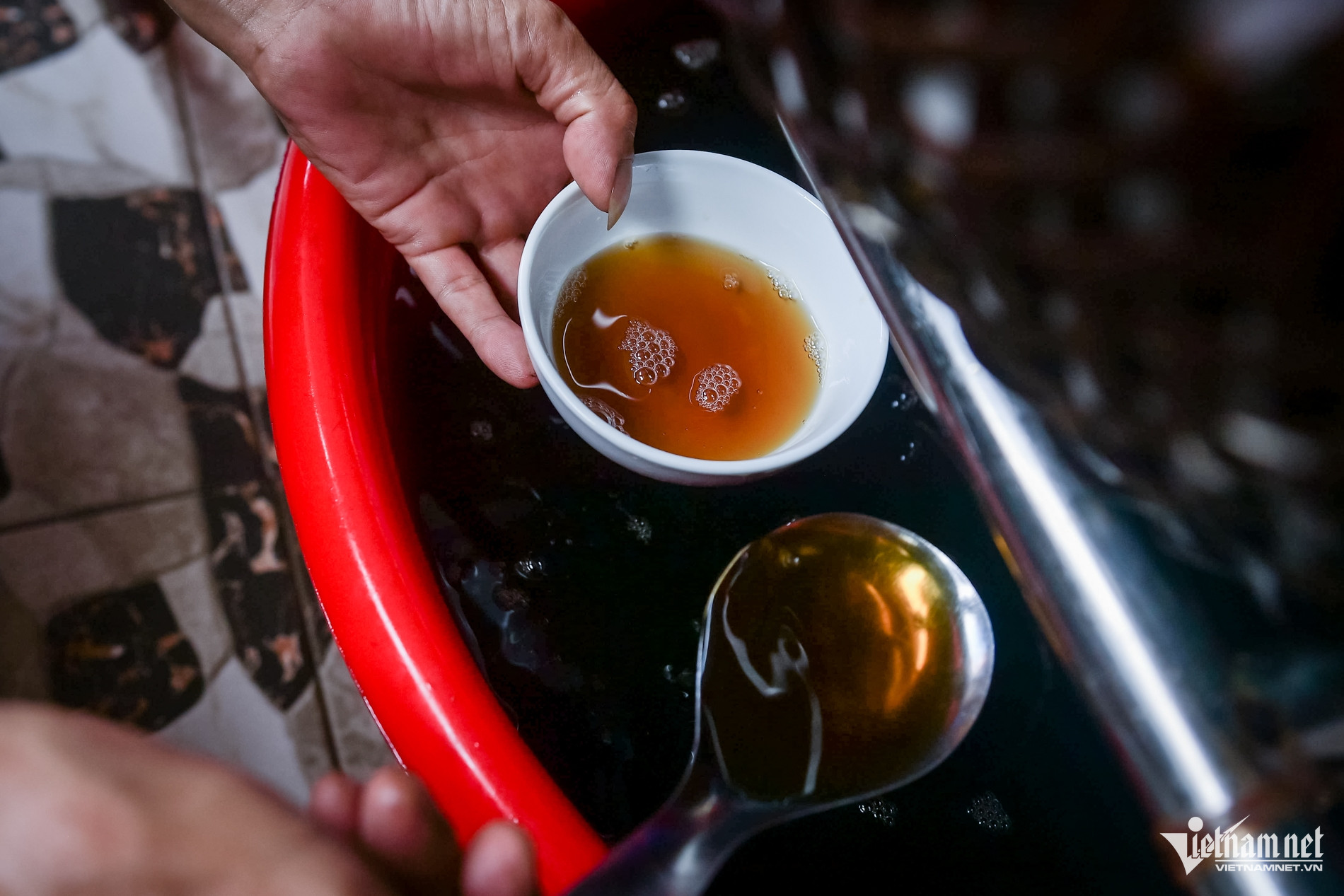 Ngay gần đó, gia đình ông Phạm Văn Hoạt (SN 1954) cũng đang khẩn trương lọc mắm để chuẩn bị hàng phục vụ thị trường Tết 2026.