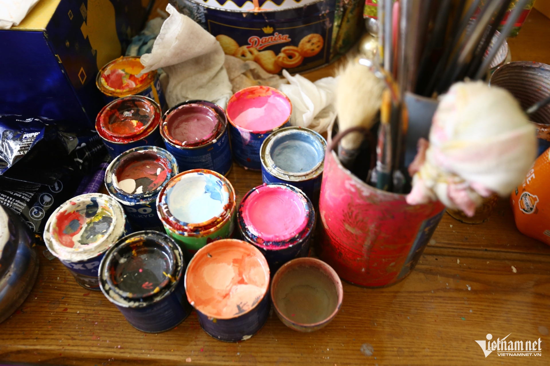Bộ màu vẽ cùng các cây cọ tự chế của họa sĩ già 75 tuổi. Ảnh: Hoàng Anh