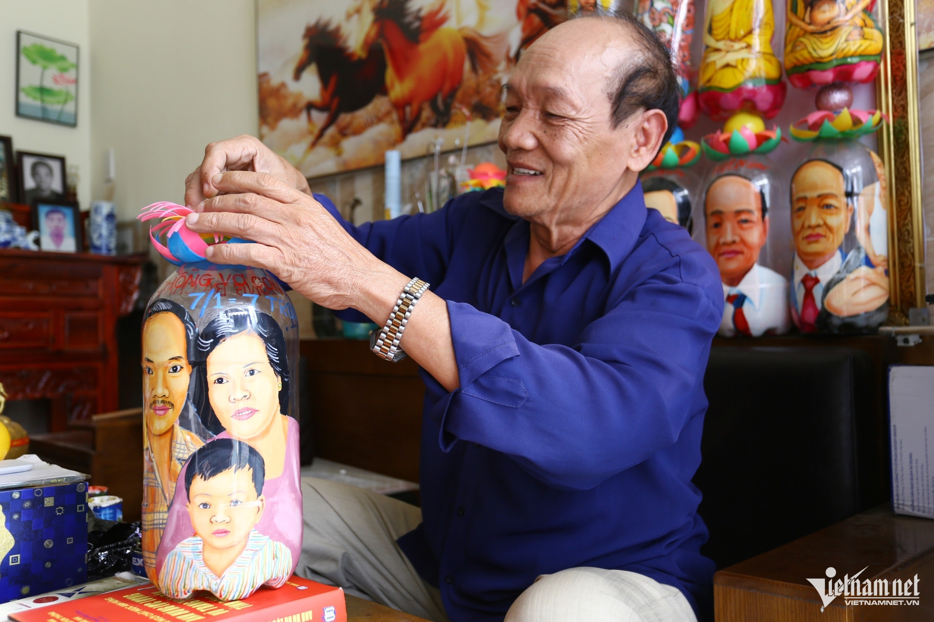 Trong căn nhà nhỏ ở phường Tân Triều, những chiếc kệ gỗ xếp chật kín chai thủy tinh, chai nhựa đủ hình dáng, kích cỡ khác nhau. Căn phòng khách của ông như biến thành một “bảo tàng nghệ thuật” thu nhỏ.