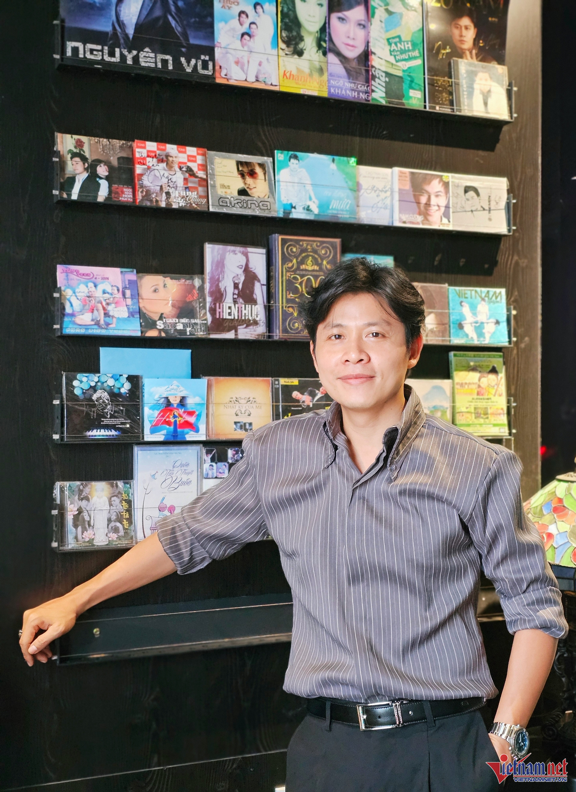 Nguyễn Văn Chung bên chiếc tủ đĩa, chứa đầy thành quả lao động đáng tự hào của anh trong 23 năm làm nghề. Ảnh: Loan Lê