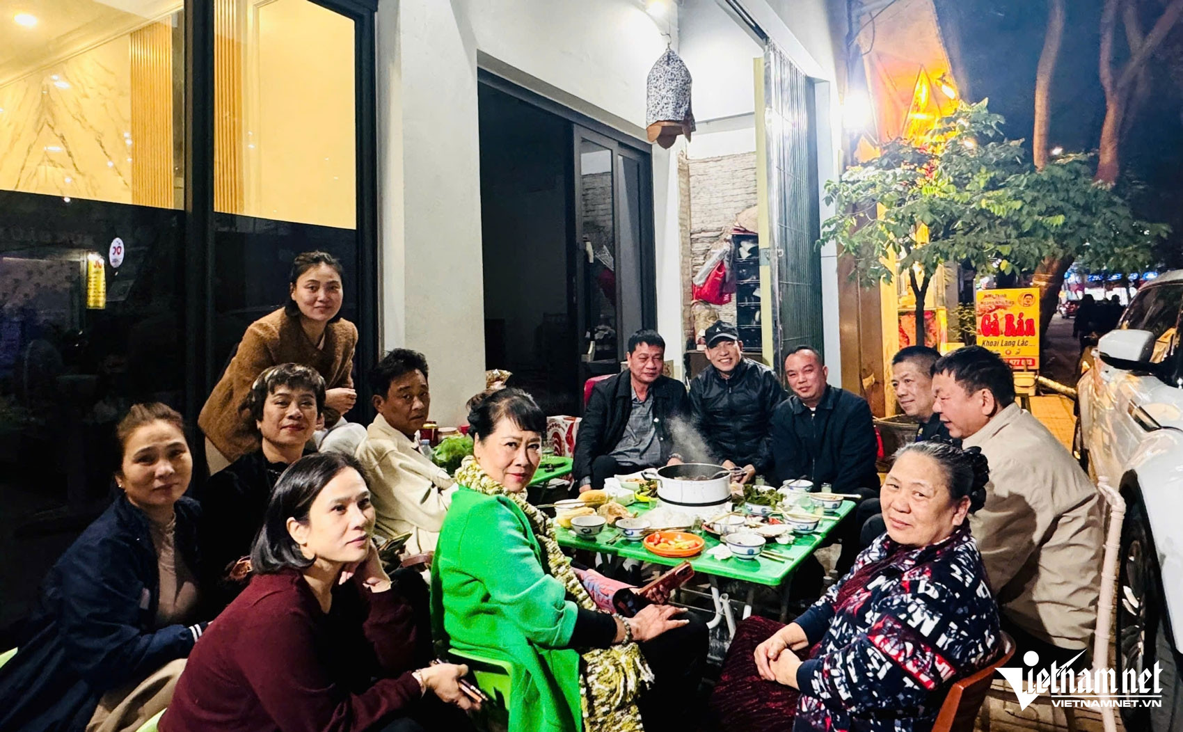 NSND Quốc Khánh (áo trắng ngồi gần chị mặc áo xanh) đi ăn lẩu với bạn bè tối 6/1. Ảnh do NSƯT Quang Thắng cung cấp.