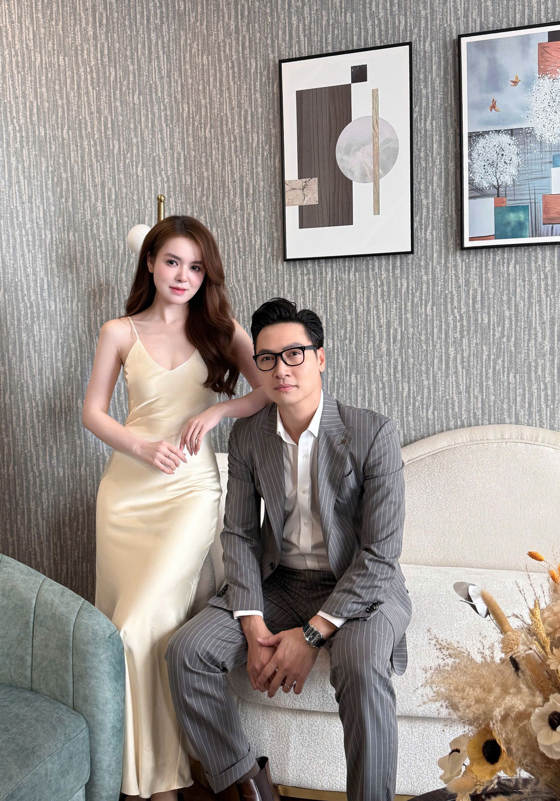Bích Ngọc và Mạnh Trường ở hậu trường phim. Cô chia sẻ với VietNamNet: "Có những cảnh tình cảm với anh Mạnh Trường, tôi cũng hơi ngại và hơi cuống nhưng tính cách anh ấy bên ngoài vui vẻ và hoà đồng nên cũng đỡ run hơn".