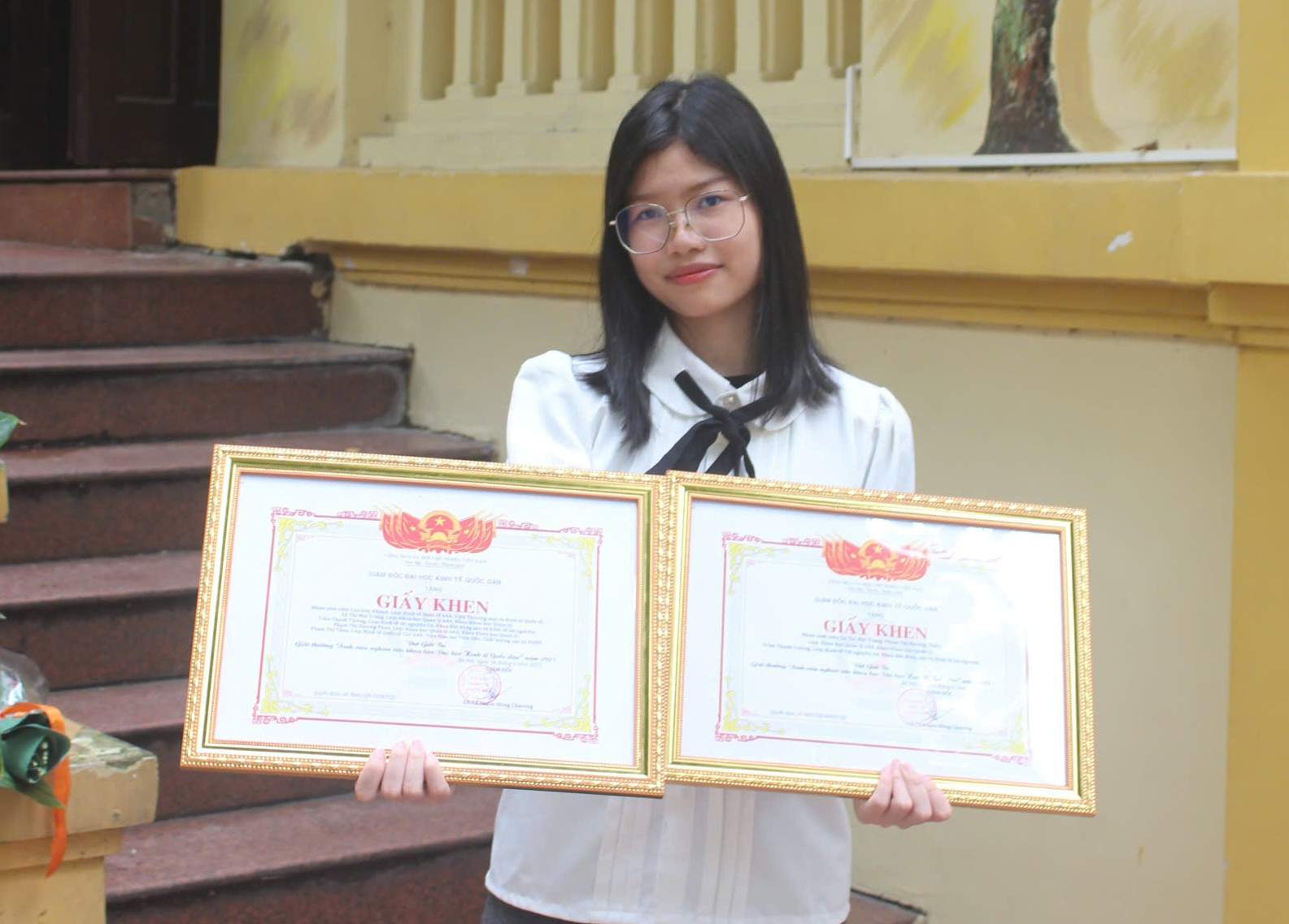 Suốt 4 năm đại học, nữ sinh duy trì điểm GPA 3.94/4.0. Từ năm nhất, em đã tham gia các cuộc thi khởi nghiệp, làm nghiên cứu khoa học và giành 3 giải nghiên cứu khoa học cấp Đại học Kinh tế Quốc dân.